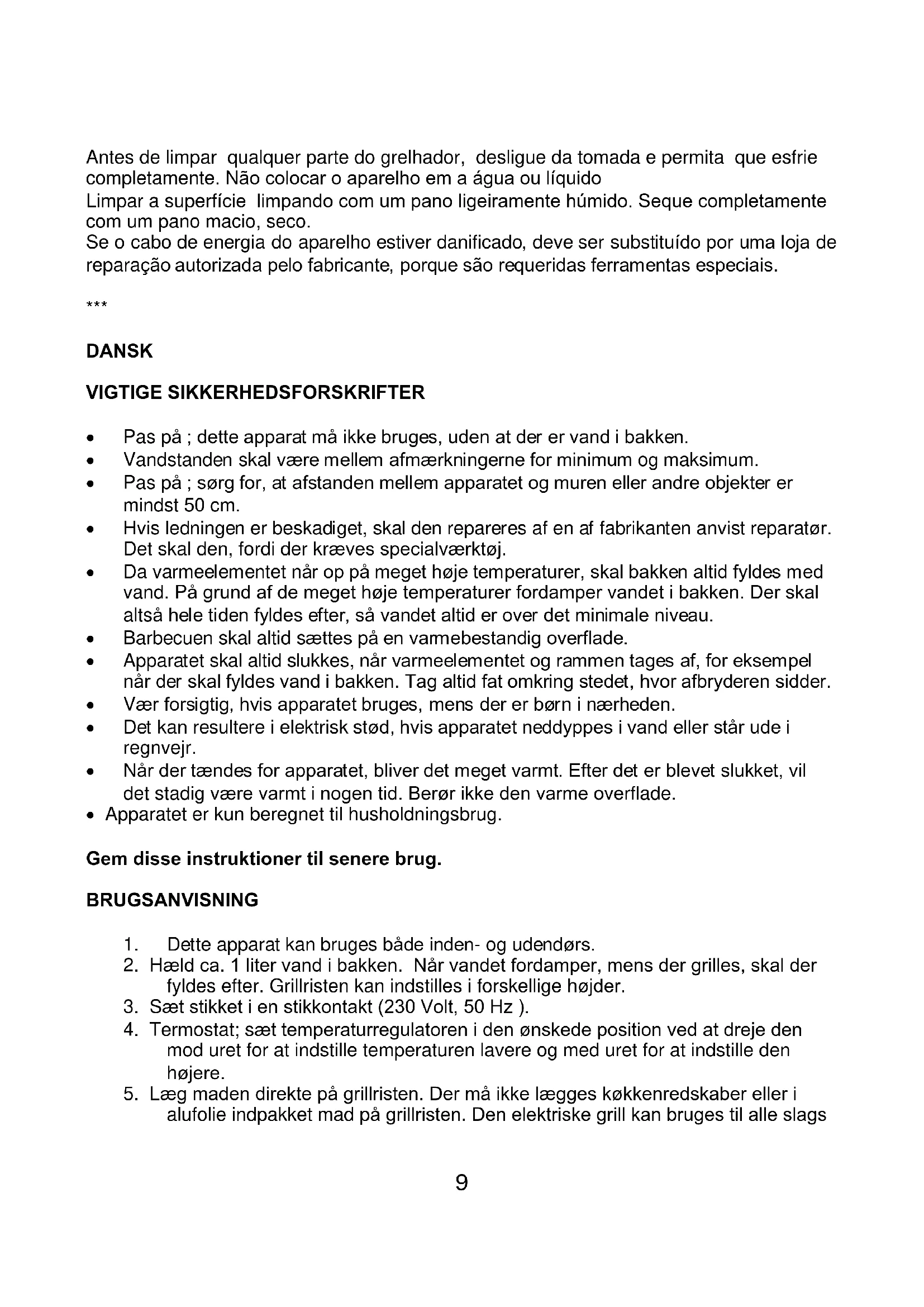DANSK VIGTIGE SIKKERHEDSFORSKRIFTER Pas på ; dette apparat må ikke bruges, uden at der er vand i bakken. Vandstanden skal være mellem afmærkningerne for minimum og maksimum. Pas på ; sørg for, at afstanden mellem apparatet og muren eller andre objekter er mindst 50 cm. Hvis ledningen er beskadiget, skal den repareres af en af fabrikanten anvist reparatør. Det skal den, fordi der kræves specialværktøj. Da varmeelementet når op på meget høje temperaturer, skal bakken altid fyldes med vand. På grund af de meget høje temperaturer fordamper vandet i bakken. Der skal altså hele tiden fyldes efter, så vandet altid er over det minimale niveau. Barbecuen skal altid sættes på en varmebestandig overflade. Apparatet skal altid slukkes, når varmeelementet og rammen tages af, for eksempel når der skal fyldes vand i bakken. Tag altid fat omkring stedet, hvor afbryderen sidder. Vær forsigtig, hvis apparatet bruges, mens der er børn i nærheden. Det kan resultere i elektrisk stød, hvis apparatet neddyppes i vand eller står ude i regnvejr. Når der tændes for apparatet, bliver det meget varmt. Efter det er blevet slukket, vil det stadig være varmt i nogen tid. Berør ikke den varme overflade. Apparatet er kun beregnet til husholdningsbrug. Gem disse instruktioner til senere brug. BRUGSANVISNING