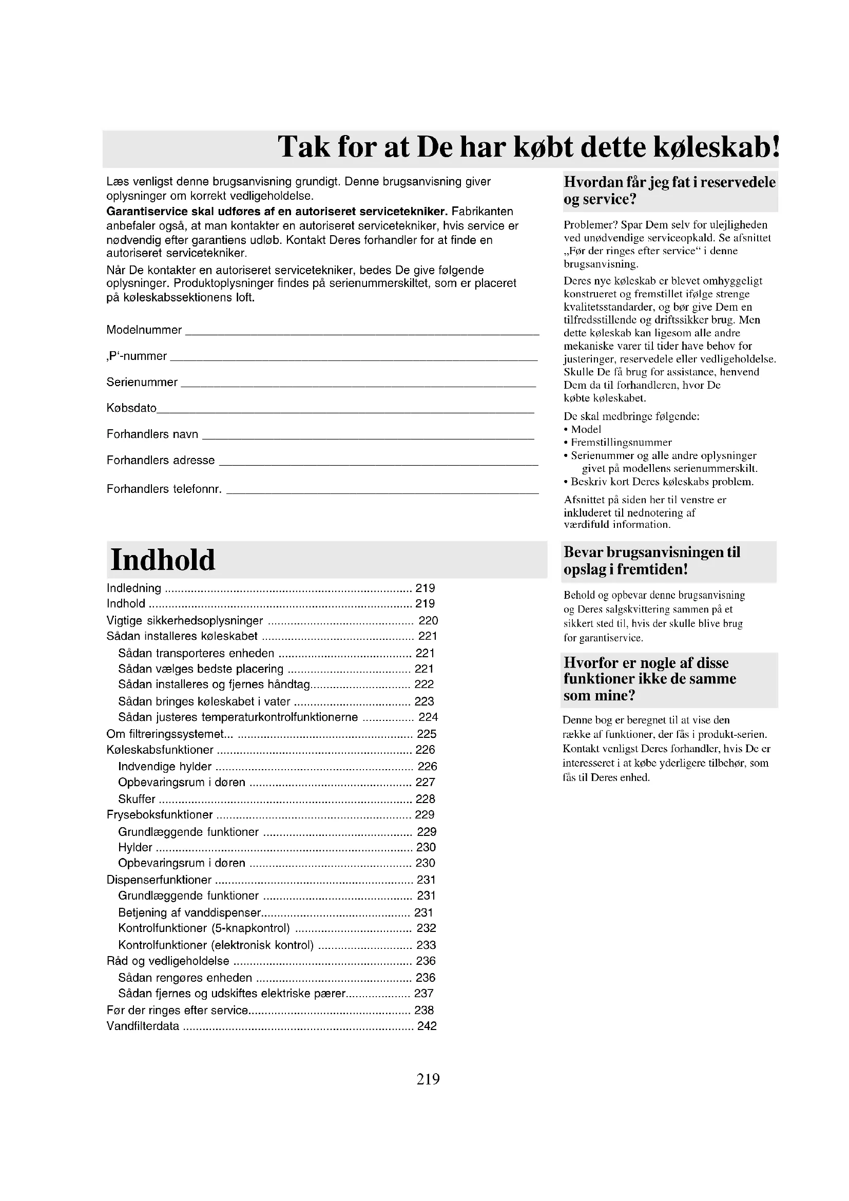 Deres nye koleskab er brevet omhyggeligt konstrueret og fremstillet ifolge strenge kvalitetsstandder, og borgive Dem en tilfredsstellende og driftssikker brug. Men dette koleskab kan ligesom alle andre mekaniske varer til cider have behov for justeringer, residedele ell er vedligeholdelse. Skulle De fbrug for assistance, henvend Dem da til forhandleren, hvor De kobe tkelekabet.