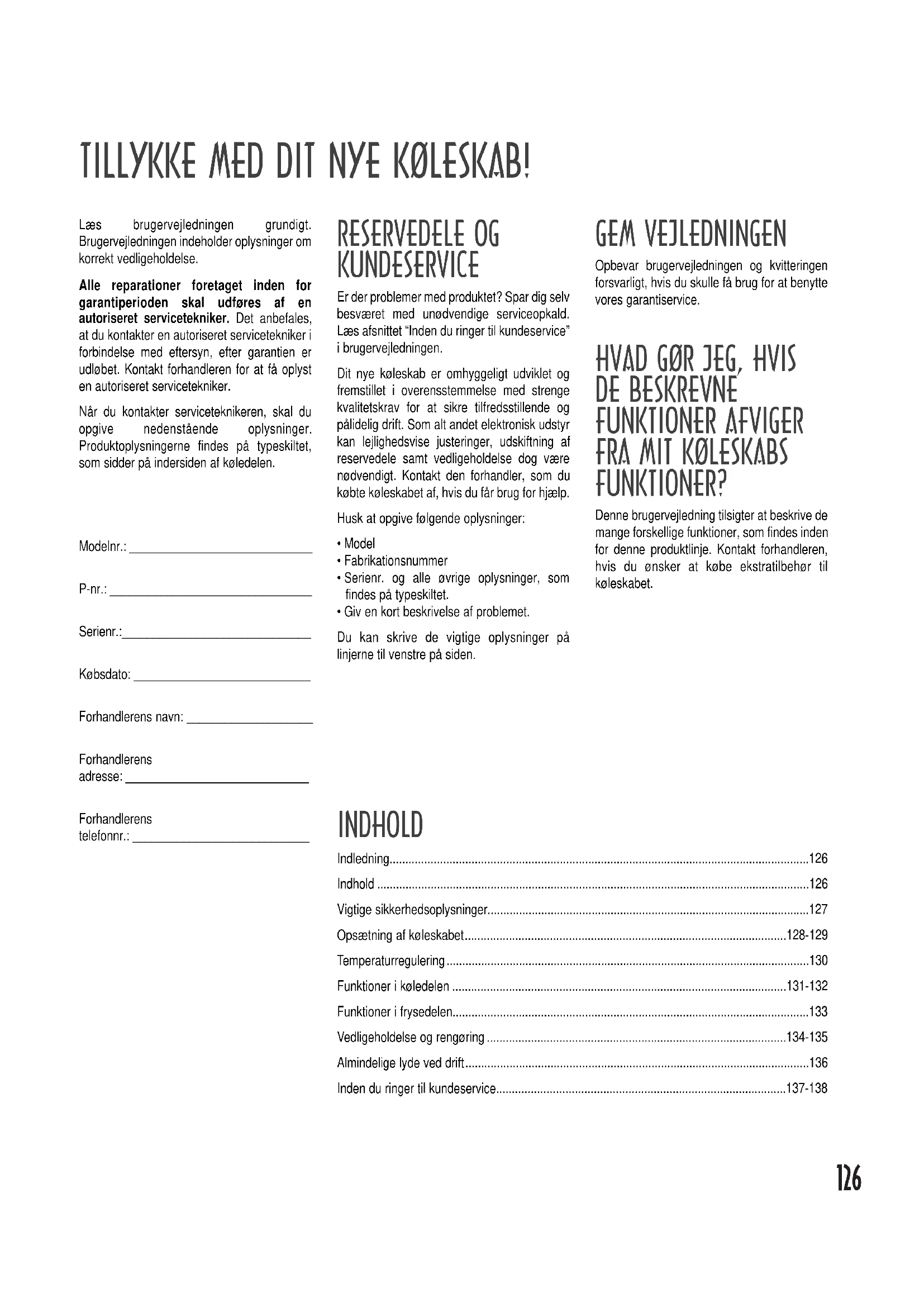 Dit nye koleskab er omhyggeligt udviklet og fremstillet i overensstemmelse med strenge kvalitetskrav for at sikre tilfredsstellende og paliidelig drift. Som alt andet elektronisk udstyr kan leljighedsvise justeringer, udskiftning af reservedele samt vedligeholdse dog vare ndvendigt. Kontakt den forhandler, som du kobte koleskabet af, hvis du fãr brug for hjælp.