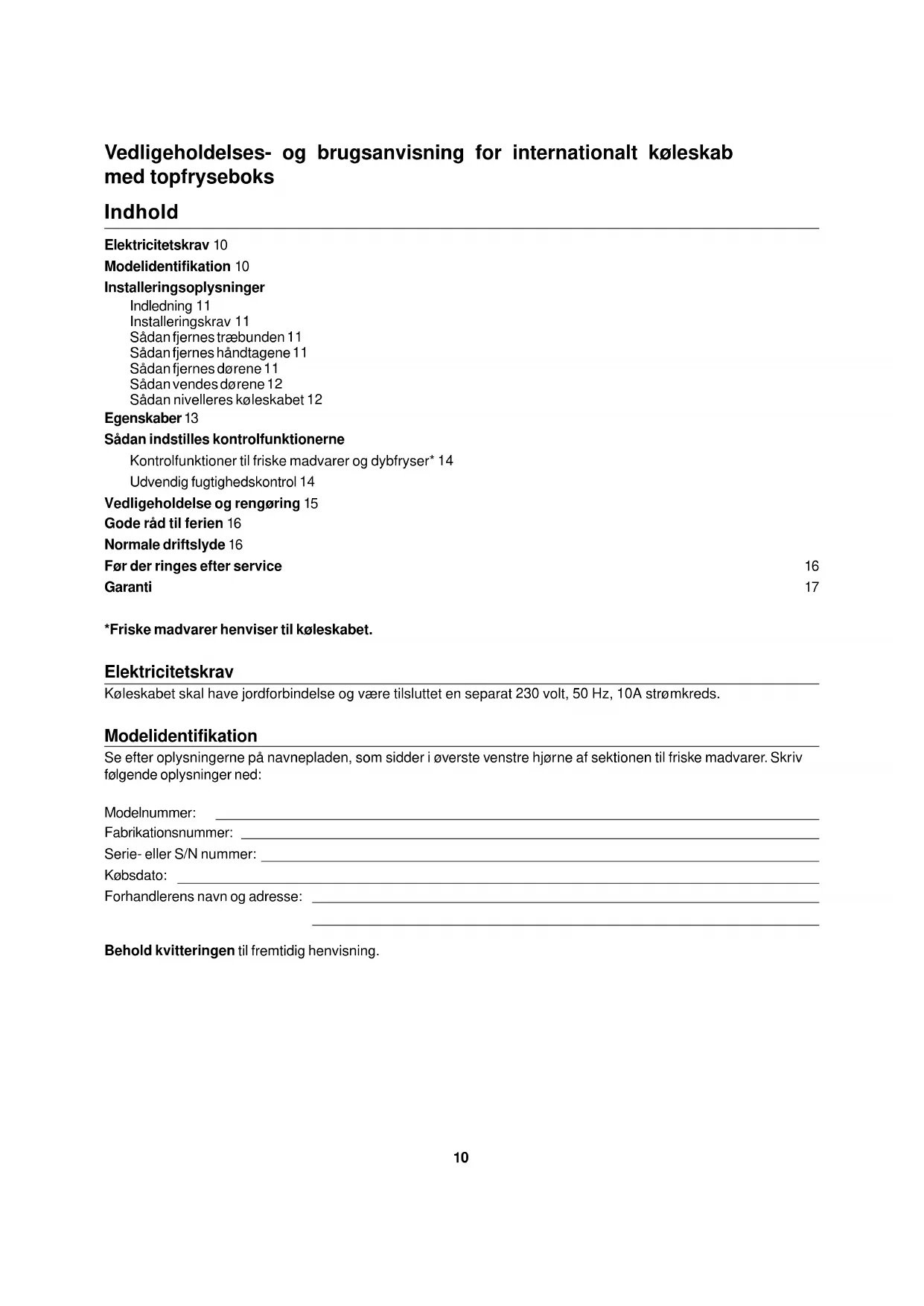Vedligeholdelses- og brugsanvisning for internationalt koleskab med topfryseboks