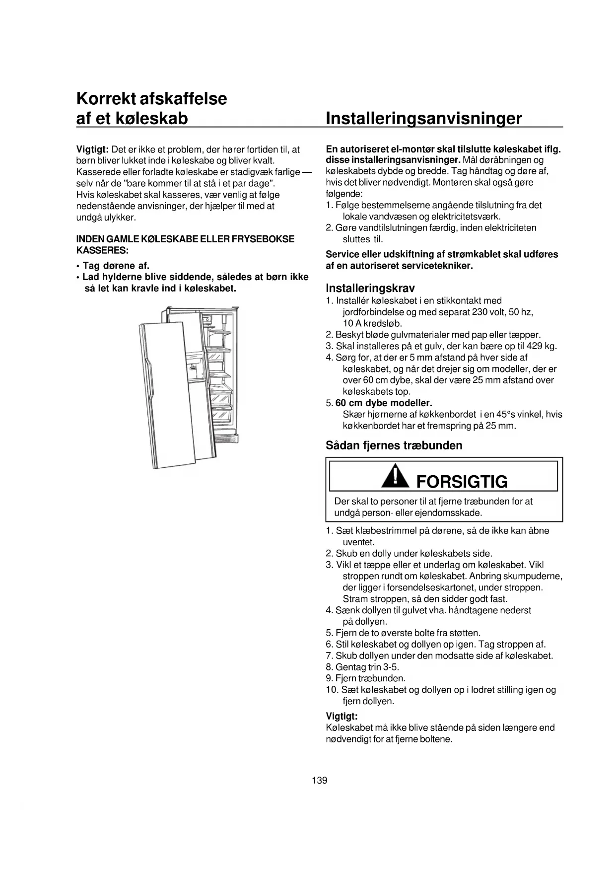 - Lad hylderne blive siddende, således at børn ikke så let kan kravle ind i køleskabet. Installeringsanvisninger En autoriseret el-montør skal tilslutte køleskabet iflg. disse installeringsanvisninger. Mål døråbningen og køleskabets dybde og bredde. Tag håndtag og døre af, hvis det bliver nødvendigt. Montøren skal også gøre følgende: