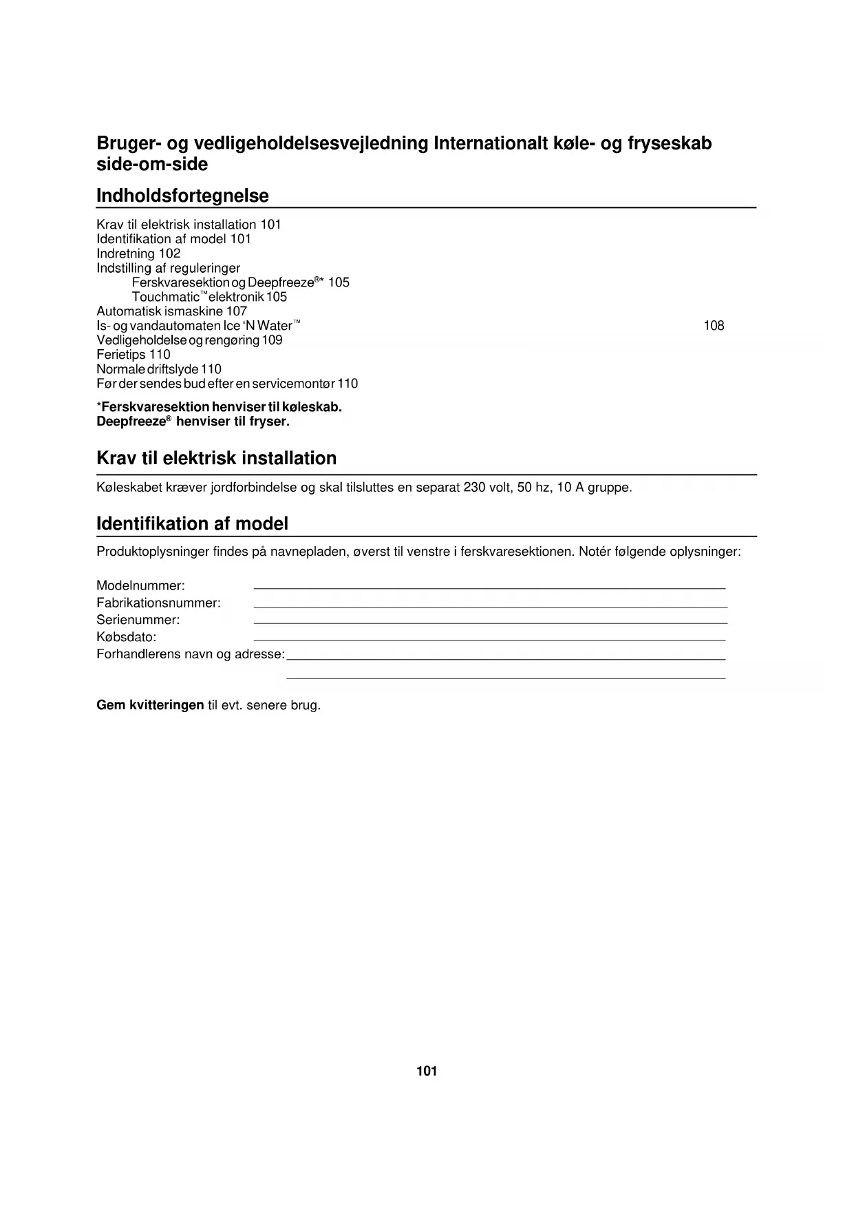 henviser til fryser. Krav til elektrisk installation Køleskabet kræver jordforbindelse og skal tilsluttes en separat 230 volt, 50 hz, 10 A gruppe. Identifikation af model Produktoplysninger findes på navnepladen, øverst til venstre i ferskvaresektionen. Notér følgende oplysninger: Modelnummer: Fabrikationsnummer: Serienummer: Købsdato: Forhandlerens navn og adresse: Gem kvitteringen til evt. senere brug.102 Indretning Ferskvaresektion (Køleskab)
