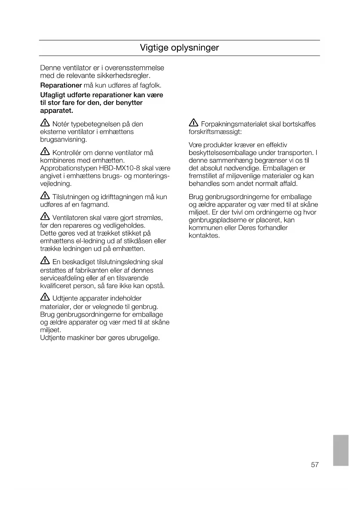 liesituulettimen välinen putkiliitos ja sähköliitos. Pistokkeen lisäsuojuksen tulee turvallisuussyistä olla aina paikoillaan ja suljettuna.57 Vigtige oplysninger Denne ventilator er i overensstemmelse med de relevante sikkerhedsregler. Reparationer må kun udføres af fagfolk. Ufagligt udførte reparationer kan være til stor fare for den, der benytter apparatet. Notér typebetegnelsen på den eksterne ventilator i emhættens brugsanvisning. Kontrollér om denne ventilator må kombineres med emhætten. Approbationstypen HBD-MX10-8 skal være angivet i emhættens brugs- og monterings- vejledning. Tilslutningen og idrifttagningen må kun udføres af en fagmand. Ventilatoren skal være gjort strømløs, før den repareres og vedligeholdes. Dette gøres ved at trækket stikket på emhættens el-ledning ud af stikdåsen eller trække ledningen ud på emhætten. En beskadiget tilslutningsledning skal erstattes af fabrikanten eller af dennes serviceafdeling eller af en tilsvarende kvalificeret person, så fare ikke kan opstå. Udtjente apparater indeholder materialer, der er velegnede til genbrug. Brug genbrugsordningerne for emballage og ældre apparater og vær med til at skåne miljøet. Udtjente maskiner bør gøres ubrugelige. Denne ventilator er i overensstemmelse med de relevante sikkerhedsregler. Reparationer må kun udføres af fagfolk. Ufagligt udførte reparationer kan være til stor fare for den, der benytter apparatet. Forpakningsmaterialet skal bortskaffes forskriftsmæssigt: Vore produkter kræver en effektiv beskyttelsesemballage under transporten. I denne sammenhæng begrænser vi os til det absolut nødvendige. Emballagen er fremstillet af miljøvenlige materialer og kan behandles som andet normalt affald. Brug genbrugsordningerne for emballage og ældre apparater og vær med til at skåne miljøet. Er der tvivl om ordningerne og hvor genbrugspladserne er placeret, kan kommunen eller Deres forhandler kontaktes.58 Inden monteringen