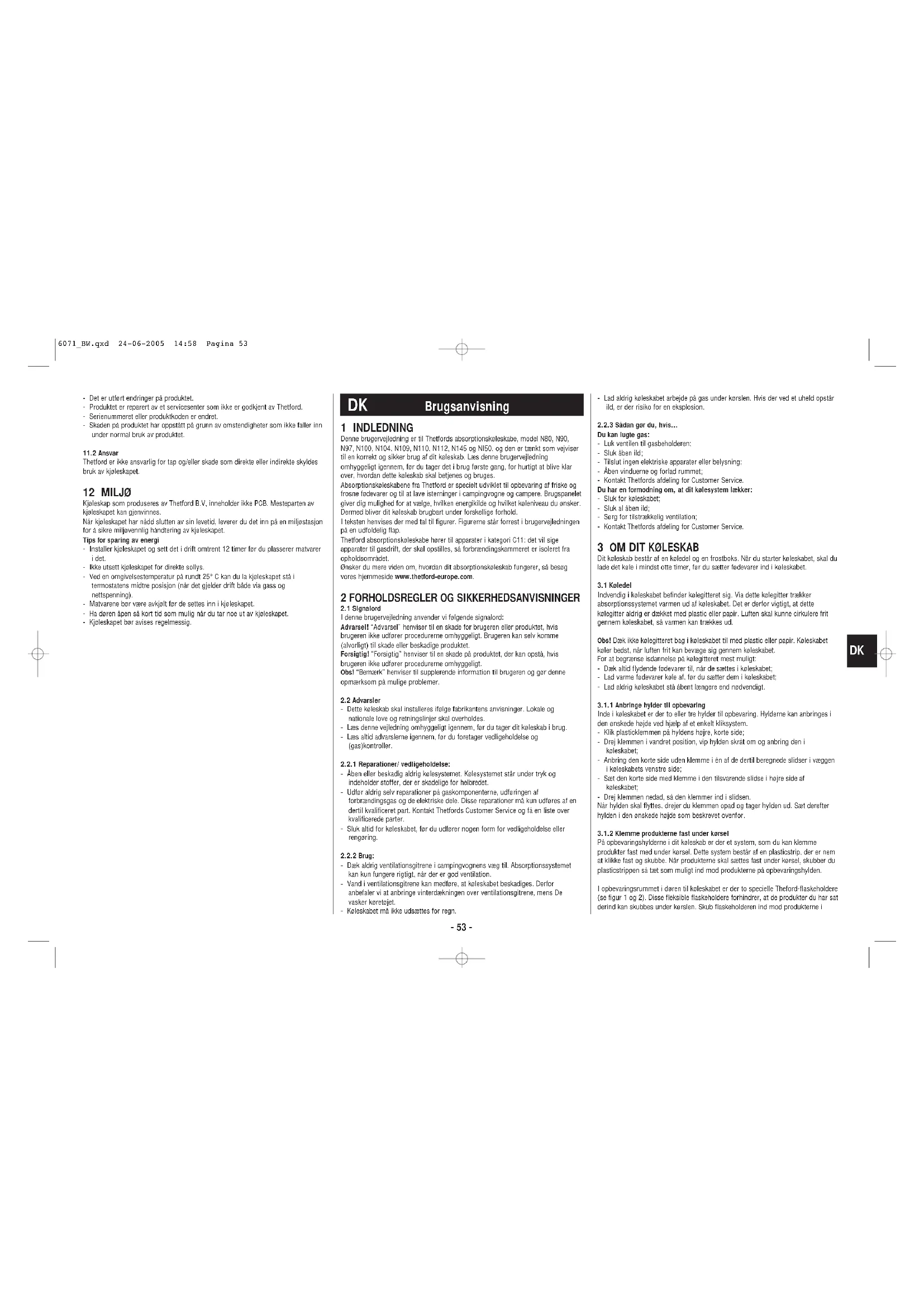 1 INDLEDNING Denne brugervejledning er til Thetfords absorptionskøleskabe, model N80, N90,N97, N100, N104, N109, N110, N112, N145 og NI50, og den er tænkt som vejvisertil en korrekt og sikker brug af dit køleskab. Læs denne brugervejledningomhyggeligt igennem, før du tager det i brug første gang, for hurtigt at blive klarover, hvordan dette køleskab skal betjenes og bruges.Absorptionskøleskabene fra Thetford er specielt udviklet til opbevaring af friske ogfrosne fødevarer og til at lave isterninger i campingvogne og campere. Brugspaneletgiver dig mulighed for at vælge, hvilken energikilde og hvilket køleniveau du ønsker.Dermed bliver dit køleskab brugbart under forskellige forhold.I teksten henvises der med tal til figurer. Figurerne står forrest i brugervejledningenpå en udfoldelig flap.Thetford absorptionskøleskabe hører til apparater i kategori C11: det vil sigeapparater til gasdrift, der skal opstilles, så forbrændingskammeret er isoleret fraopholdsområdet.Ønsker du mere viden om, hvordan dit absorptionskøleskab fungerer, så besøgvores hjemmeside www.thetford-europe.com.