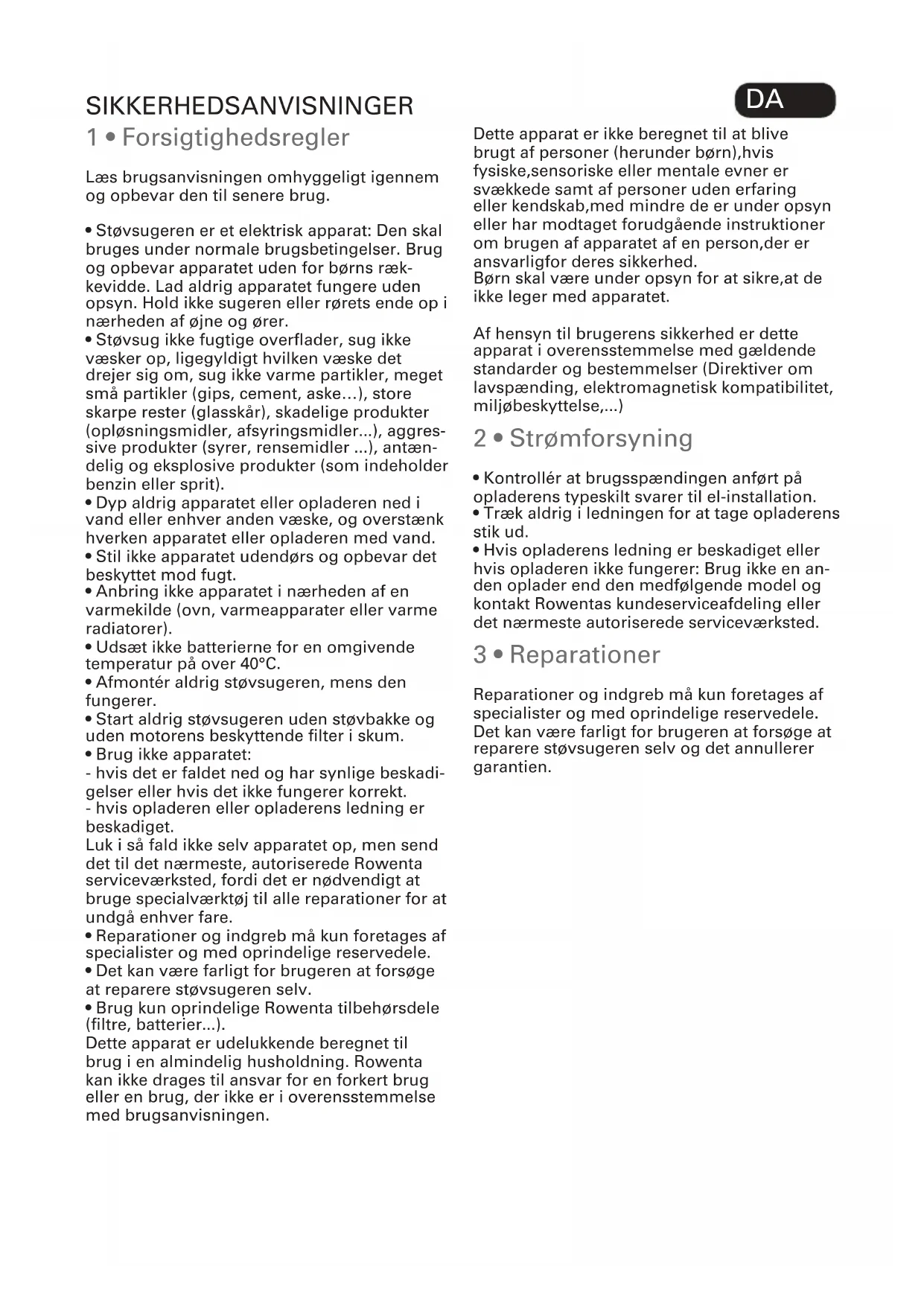 - Hvis opladerens ledning er beskadiget eller hvis opladeren ikke fungerer: Brug ikke en an- den oplader end den medfølgende model og kontakt Rowentas kundeserviceafdeling eller det nærmeste autoriserede serviceværksted. 3 • Reparationer Reparationer og indgreb må kun foretages af specialister og med oprindelige reservedele. Det kan være farligt for brugeren at forsøge at reparere støvsugeren selv og det annullerer garantien. SIKKERHEDSANVISNINGER130