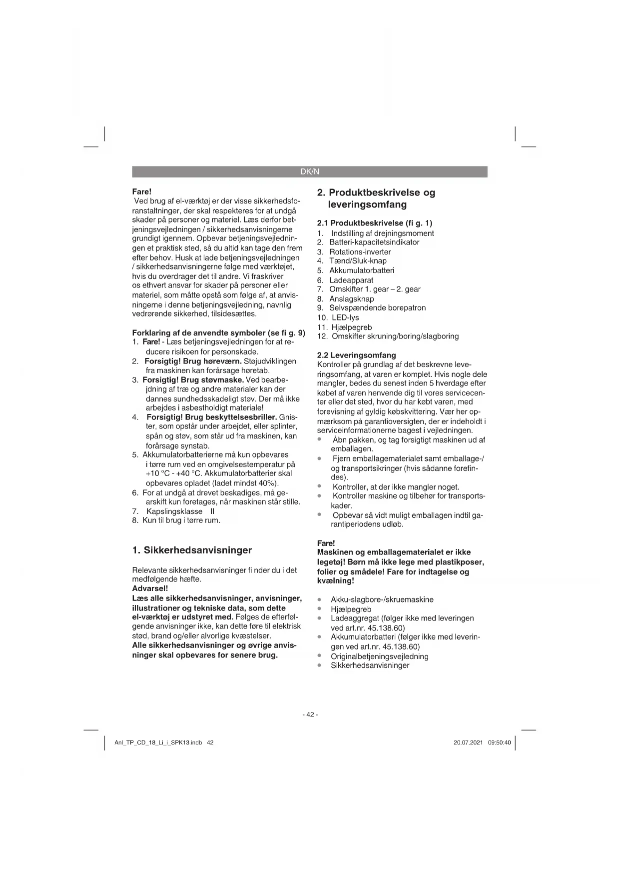 Visningsstatus Betydning og påkrævet handling Rød lysdi- ode Grøn lysdi- ode Slukket Blinker Standby-modus Ladeaggregatet er forbundet med nettet og klar til drift, akkumulatorbatte- riet er ikke i ladeaggregatet Tændt Slukket Opladning Ladeaggregatet lader akkumulatorbatteriet op i hurtigladningsmodus. De pågældende ladetider fi ndes direkte på ladeaggregatet. Bemærk! De faktiske ladetider kan afvige noget fra de angivede ladetider afhængigt af den eksisterende akkuladning. Slukket Tændt Akkumulatorbatteriet er opladt og klar til brug. Herefter skiftes til skånende opladning, indtil fuldstændig opladning er nået. Lad hertil akkumulatorbatteriet blive ca. 15 min. længere på ladeaggrega- tet. Påkrævet handling: Tag akkumulatorbatteriet ud af ladeaggregatet. Afbryd ladeaggregatet fra strømforsyningsnettet. Blinker Slukket Tilpasningsopladning Ladeaggregatet befi nder sig i funktionen for skånsom opladning. Her oplades akkumulatorbatteriet af sikkerhedsgrunde langsommere og skal bruge mere tid. Det kan have følgende årsager: - Akkumulatorbatteriet er ikke blevet opladet i meget lang tid. - Akkumulatorbatteriets temperatur ligger ikke i det ideelle område. Påkrævet handling: Vent, indtil ladeprocessen er færdig, akkumulatorbatteriet kan stadigvæk oplades. Blinker Blinker Fejl Opladning er ikke længere mulig. Akkumulatorbatteriet er defekt. Påkrævet handling: Et defekt akkumulatorbatteri må ikke længere oplades. Tag akkumulatorbatteriet ud af ladeaggregatet. Tændt Tændt Temperaturfejl Akkumulatorbatteriet er for varmt (f.eks. direkte solindfald) eller for koldt (under 0° C). Påkrævet handling: Tag batteriet ud, og opbevar det 1 dag ved stuetemperatur (ca. 20° C). Anl_TP_CD_18_Li_i_SPK13.indb 47Anl_TP_CD_18_Li_i_SPK13.indb 47 20.07.2021 09:50:4120.07.2021 09:50:41DK/N