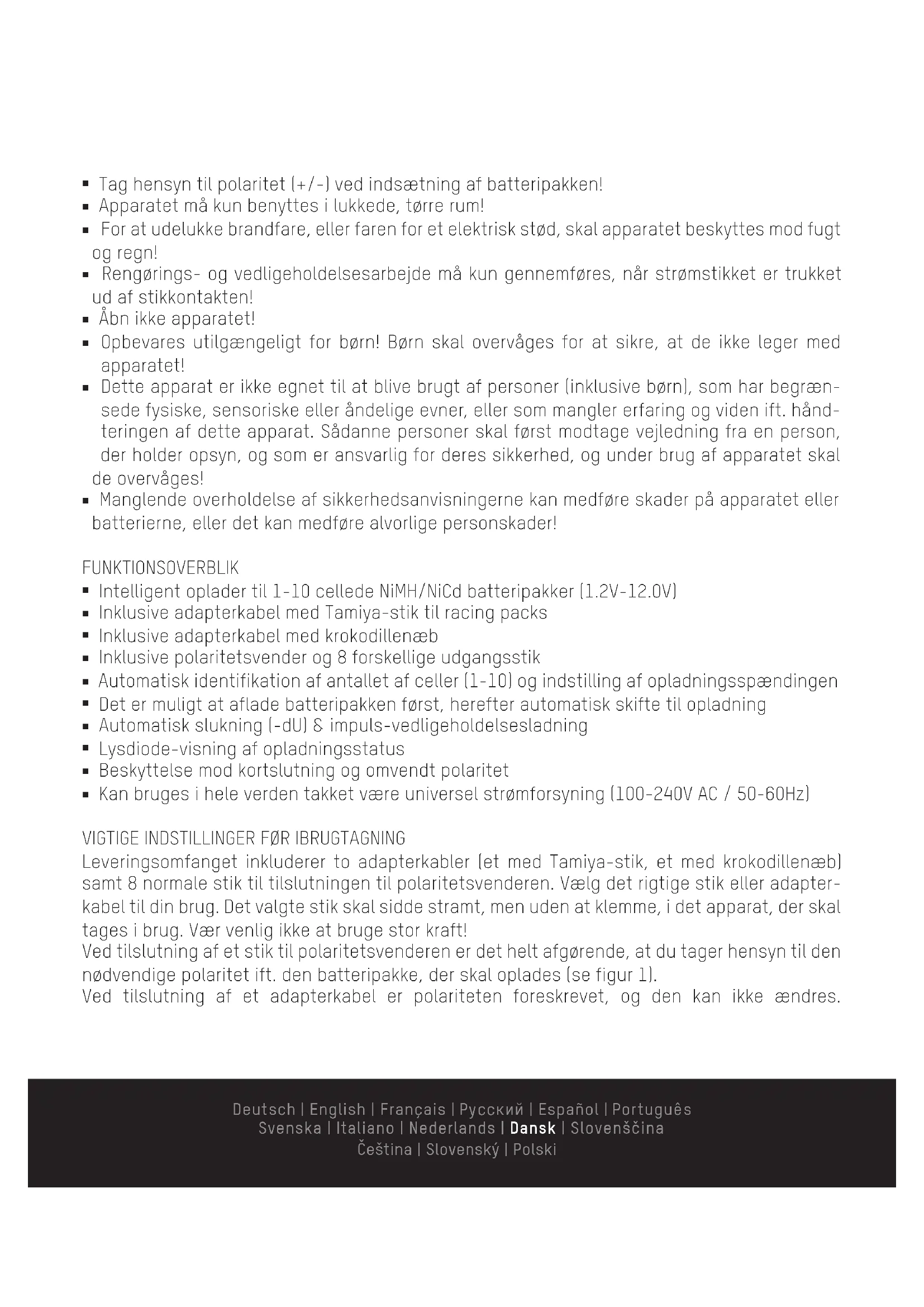 Leveringsomfanget inkluderer to adapterkabler (et med Tamiya-stik, et med krokodillenæb) samt 8 normale stik til tilslutningen til polaritetsvenderen. Vælg det rigtige stik eller adapter- kabel til din brug. Det valgte stik skal sidde stramt, men uden at klemme, i det apparat, der skal tages i brug. Vær venlig ikke at bruge stor kraft! Ved tilslutning af et stik til polaritetsvenderen er det helt afgørende, at du tager hensyn til den nødvendige polaritet ift. den batteripakke, der skal oplades (se figur 1). Ved tilslutning af et adapterkabel er polariteten foreskrevet, og den kan ikke ændres.Deutsch | English | Français | Pусский | Español | Português Svenska | Italiano | Nederlands | Dansk | Slovenščina Čeština | Slovenský | Polski Polariteten ved adapterkablet med krokodillenæb er: „+“ rødt næb / „-“ sort næb. Forkert polaritet kan ødelægge batteripakken! IBRUGTAGNING og FUNKTION Indsæt batteripakken i opladeren og tilslut opladeren til strømforsyningen (100-240V AC 50- 60Hz). Ved korrekt polaritet starter opladningen automatisk og opladningsstatus-visningen blinker grønt. Hvis visningen blinker rødt, så tjek batteripakken, den er enten blevet tilsluttet med omvendt polaritet, eller også er den defekt (kortslutning). Med denne oplader kan du også aflade batteripakker, før de bliver opladet. Tryk til det formål kort på opladerens „Discharge“-taste. Opladningsstatus-visningen lyser gult, hvilket signa- lerer afladning. Så snart batteriet er afladet, skifter apparatet automatisk til opladning. En opvarmning af batteripakken under opladningen er normal. TIP: Vi anbefaler altid før-afladningsfunktionen ved NiCd-batteripakker, idet den sørger for, at disse også fungerer pålideligt efter længere tid og uden Memory-effekt. Ved NiMH-batteripak- ker er en før-afladning grundlæggende ikke nødvendig. Vi anbefaler blot en før-afladning efter 40-50 delvise opladningscyklusser af NiMH batterier. Hvis du ved en fejl har startet opladningen, eller hvis du ønsker at afslutte opladningen før tid, så træk stikket til opladeren i kort tid, så den er adskilt fra elnettet, eller afbryd i kort tid kontakten til batteripakken for at skifte til opladningstilstanden. Opladeren kan se, når batteriet er fuldt opladet (-dU), så når opladnings-slutspændingen er nået afsluttes opladningen automatisk, og der skiftes til opladnings-vedligeholdelsestilstan- den. Denne funktion garanterer en optimal ydelse, og den forhindrer, at batteriet selvaflader. Opladningsstatus-visningen lyser permanent grønt, så snart dit batteri er ladet helt op. Du kan nu benytte batteripakken. MILJØOPLYSNINGER Smid under ingen omstændigheder apparatet i den normale skraldespand for husholdning- saffald. Bortskaf apparatet vha. et godkendt affaldshåndteringsanlæg eller din kommunale renovationsordning. Overhold de aktuelt gældende forskrifter. Hvis du er i tvivl, så tag kontakt til dit renovationsfirma. Bortskaf alle emballagematerialer på en miljøvenlig måde. VEDLIGEHOLDELSE/PLEJE Hold venligst opladerens og batteriernes kontakter fri for snavs for at sikre, at apparatet fun- gerer korrekt. Rengør kun apparatet, når strømkablet er trukket ud af stikkontakten, og brug en tør klud.Deutsch | English | Français | Pусский | Español | Português Svenska | Italiano | Nederlands | Dansk | Slovenščina Čeština | Slovenský | Polski TEKNISKE DATA Indgangsspænding: 100-240V AC / 50-60Hz Udgangsspænding: 1,45V – 14,5V (til 1,2V-12,0V batteripakker) Opladningsstrøm: 800mA Afladningsstrøm: 150mA - 200mA Opladelige batterikapaciteter: 800mAh - 10000mAh Opladningstid: ca. 1,5 timer pr. 1000mAh ANSVARSFRASKRIVELSE De oplysninger, som denne brugsanvisning indeholder, kan ændres uden forudgående varsel. ANSMANN hæfter ikke for direkte, indirekte, tilfældige eller andre skader eller følgeskader, der er opstået pga. ukorrekt håndtering eller manglende overholdelse af de informationer, som denne brugsanvisning indeholder. GARANTIBETINGELSER Vi giver tre års garanti på apparatet. Ved skader på apparatet, som opstår som følge af manglende overholdelse af brugsanvisningen, eller som forårsages af dårlige batterier, kan der ikke gives garanti. Der tages forbehold for tekniske ændringer. Vi hæfter ikke for trykfejl. 04/2015
