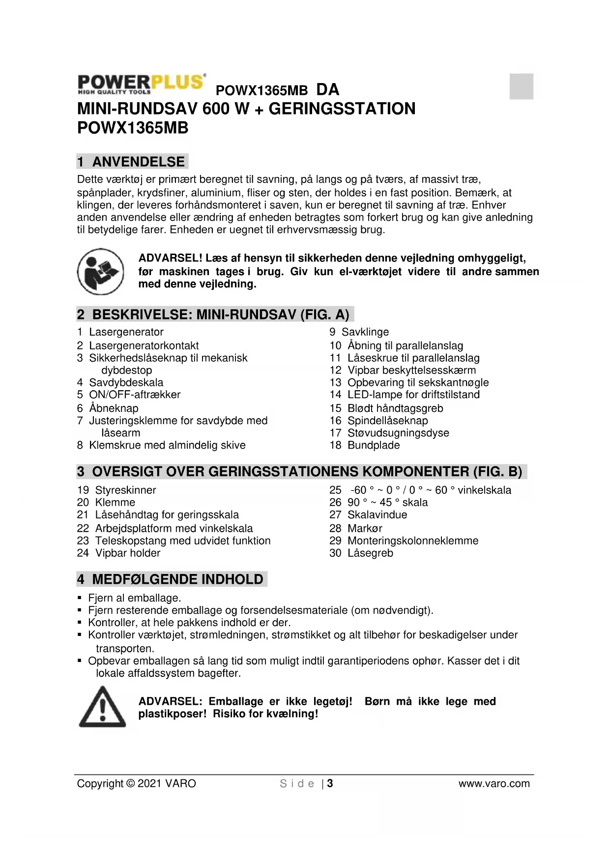 Fjern al emballage. Fjern resterende emballage og forsendelsesmateriale (om nødvendigt). Kontroller, at hele pakkens indhold er der. Kontroller værktøjet, strømledningen, strømstikket og alt tilbehør for beskadigelser under transporten. Opbevar emballagen så lang tid som muligt indtil garantiperiodens ophør. Kasser det i dit lokale affaldssystem bagefter. ADVARSEL: Emballage er ikke legetøj! Børn må ikke lege med plastikposer! Risiko for kvælning!POWX1365MB DA Copyright © 2021 VARO S i d e | 4 www.varo.com 1 værktøjsenhed 1 vejledning 1 savklinge med tænder i hærdet metal (A): Egnet til: blødt træ, hårdttræ, alle slags plader 1 diamantsavklinge (D): Egnet til: keramik, fliser 1 HSS-savklinge (D): Egnet til: blødt metal, aluminium 1 støvudsugningsslange (B) 1 indre sekskantnøgle (F) 1 parallelanslag (G) 1 geringsstation Kontakt venligst forhandleren, når der mangler dele, eller de er beskadigede. 5 SYMBOLER I denne brugervejledning og/eller på maskinen anvendes der følgende piktogrammer: