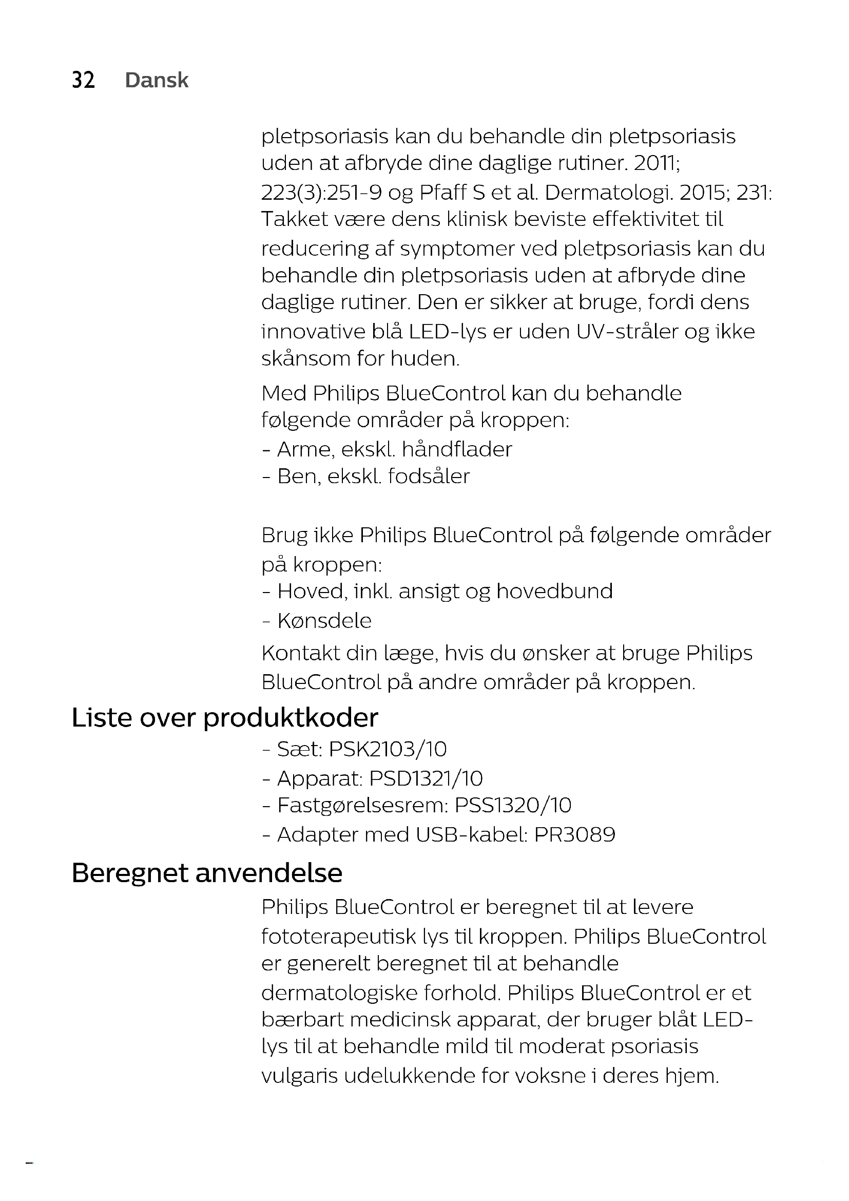 Danskpletpsoriasis kan du behandle din pletpsoriasis uden at afbryde dine daglige rutiner. 2011; 223(3):251-9 og Pfaff S et al. Dermatologi. 2015; 231: Takket være dens klinisk beviste effektivitet til reducering af symptomer ved pletpsoriasis kan du behandle din pletpsoriasis uden at afbryde dine daglige rutiner. Den er sikker at bruge, fordi dens innovative blå LED-lys er uden UV-stråler og ikke skånsom for huden. Med Philips BlueControl kan du behandle følgende områder på kroppen: - Arme, ekskl. håndflader - Ben, ekskl. fodsåler Brug ikke Philips BlueControl på følgende områder på kroppen: - Hoved, inkl. ansigt og hovedbund - Kønsdele Kontakt din læge, hvis du ønsker at bruge Philips BlueControl på andre områder på kroppen. Liste over produktkoder - Sæt: PSK2103/10 - Apparat: PSD1321/10 - Fastgørelsesrem: PSS1320/10 - Adapter med USB-kabel: PR3089 Beregnet anvendelse Philips BlueControl er beregnet til at levere fototerapeutisk lys til kroppen. Philips BlueControl er generelt beregnet til at behandle dermatologiske forhold. Philips BlueControl er et bærbart medicinsk apparat, der bruger blåt LED- lys til at behandle mild til moderat psoriasis vulgaris udelukkende for voksne i deres hjem.