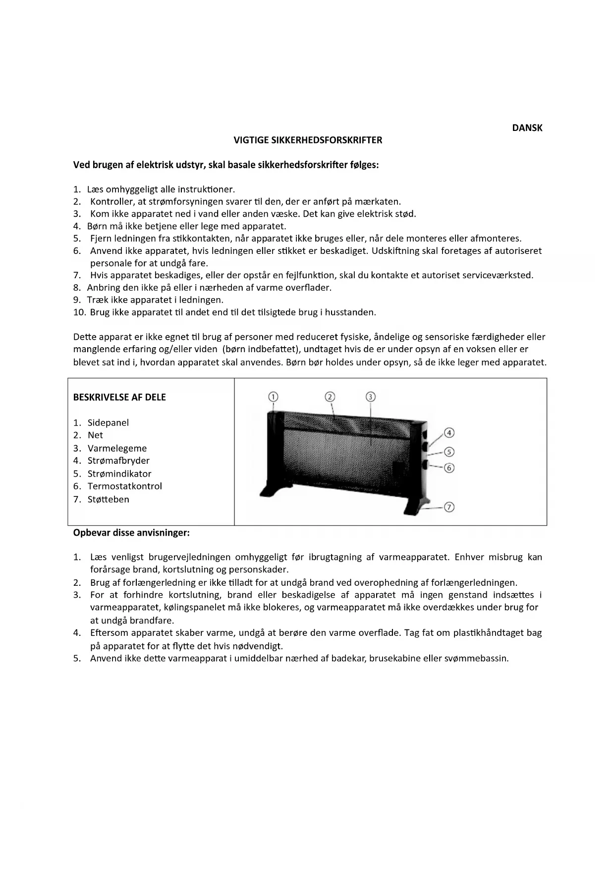 - Læs venligst brugervejledningen omhyggeligt før ibrugtagning af varmeapparatet. Enhver misbrug kan forårsage brand, kortslutning og personskader.