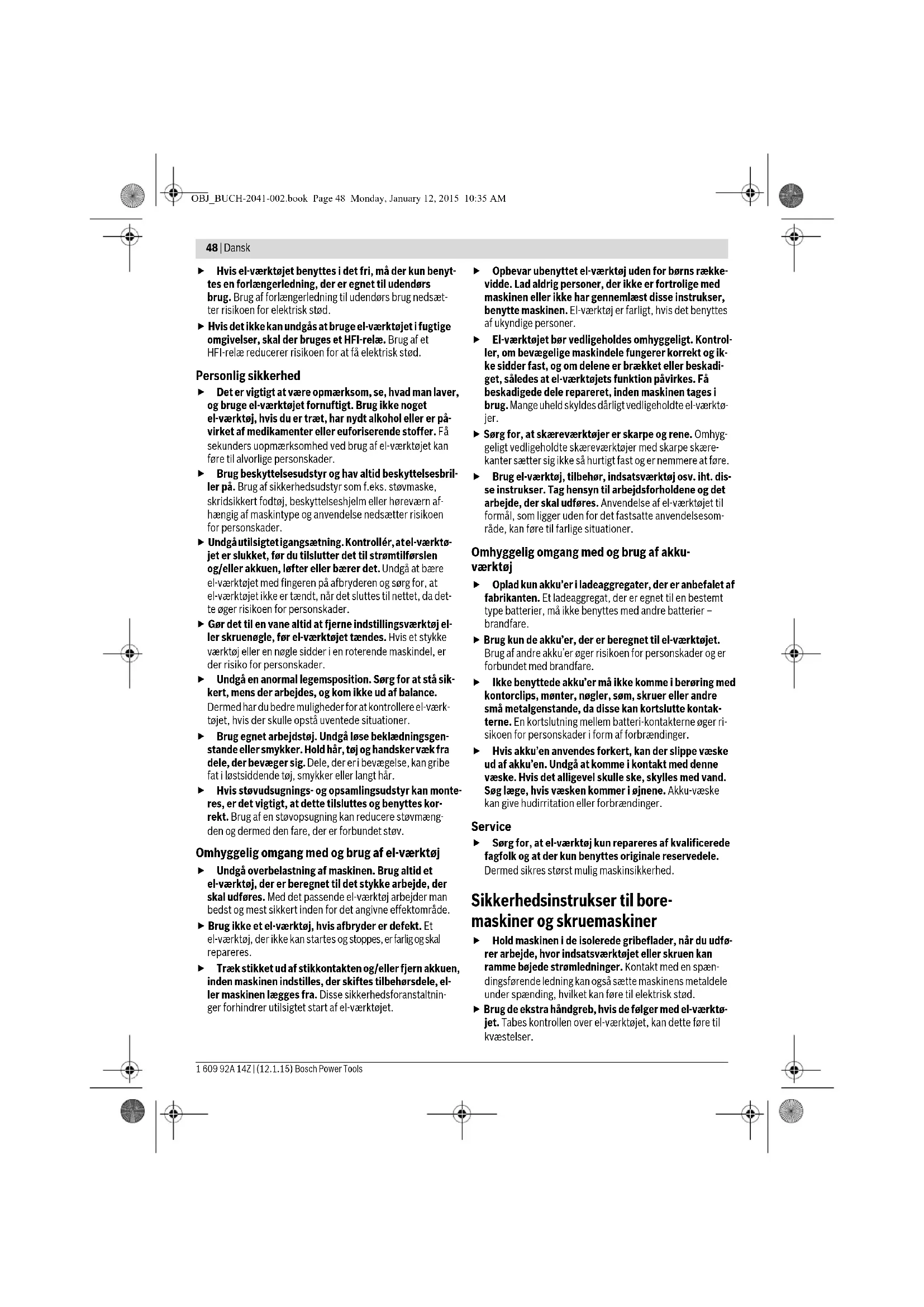 Kleurclip monteren/demonteren 12 209 Bithouder monteren/demonteren 13 209 Mechanische toerentalkeuze 14 209 In- en uitschakelen 15 210 Oplaadtoestand van de accu controleren 16 210 Toebehoren kiezen – 211 – 212 Handelingsdoel Afbeelding Neem het volgende in acht Pagina OBJ_BUCH-2041-002.book Page 46 Monday, January 12, 2015 10:35 AMDansk | 47 Bosch Power Tools 1 609 92A 14Z | (12.1.15) Onderhoud en reiniging Houd het elektrische gereedschap en de ventilatieope- ningen altijd schoon om goed en veilig te werken. Maak na elk gebruik het inzetgereedschap, de gereedschap- opname en de ventilatiesleuven van elektrische gereedschap schoon. Maak ook de ventilatiesleuven van de accu schoon. Klantenservice en gebruiksadviezen Onze klantenservice beantwoordt uw vragen over reparatie en onderhoud van uw product en over vervangingsonderde- len. Explosietekeningen en informatie over vervangingson- derdelen vindt u ook op: www.bosch-pt.com Het Bosch-team voor gebruiksadviezen helpt u graag bij vra- gen over onze producten en toebehoren. Vermeld bij vragen en bestellingen van vervangingsonderde- len altijd het uit tien cijfers bestaande productnummer vol- gens het typeplaatje van het elektrische gereedschap. Nederland Tel.: (076) 579 54 54 Fax: (076) 579 54 94 E-mail: gereedschappen@nl.bosch.com België Tel.: (02) 588 0589 Fax: (02) 588 0595 E-mail: outillage.gereedschap@be.bosch.com Vervoer Op de meegeleverde lithiumionaccu’s zijn de eisen voor het vervoer van gevaarlijke stoffen van toepassing. De accu’s kun- nen door de gebruiker zonder verdere voorwaarden over de weg worden vervoerd. Bij de verzending door derden (bijv. luchtvervoer of expedi- tiebedrijf) moeten bijzondere eisen ten aanzien van verpak- king en markering in acht worden genomen. In deze gevallen moet bij de voorbereiding van de verzending een deskundige voor gevaarlijke goederen worden geraadpleegd. Verzend accu’s alleen als de behuizing onbeschadigd is. Plak blootliggende contacten af en verpak de accu zodanig dat de- ze niet in de verpakking beweegt. Neem ook eventuele overige nationale voorschriften in acht. Afvalverwijdering Elektrische gereedschappen, accu’s, toebehoren en verpakkingen moeten op een voor het milieu verant- woorde wijze worden hergebruikt. Gooi elektrische gereedschappen, accu’s en batterijen niet bij het huisvuil. Alleen voor landen van de EU: Volgens de Europese richtlijn 2012/19/EU moeten niet meer bruikbare elektrische ge- reedschappen en volgens de Europese richt- lijn 2006/66/EG moeten defecte of lege ac- cu’s en batterijen apart worden ingezameld en op een voor het milieu verantwoorde wijze worden hergebruikt. Wijzigingen voorbehouden. Dansk Generelle sikkerhedsinstrukser til el-værktøj Læs alle sikkerhedsinstrukser og an- visninger. I tilfælde af manglende over- holdelse af sikkerhedsinstrukserne og anvisningerne er der ri- siko for elektrisk stød, brand og/eller alvorlige kvæstelser. Opbevar alle sikkerhedsinstrukser og anvisninger til se- nere brug. Det i sikkerhedsinstrukserne benyttede begreb „el-værktøj“ refererer til netdrevet el-værktøj (med netkabel) og akkudre- vet el-værktøj (uden netkabel). Sikkerhed på arbejdspladsen Sørg for, at arbejdsområdet er rent og rigtigt belyst. Uorden eller uoplyste arbejdsområder øger faren for uheld. Brug ikke el-værktøjet i eksplosionsfarlige omgivelser, hvor der findes brændbare væsker, gasser eller støv. El-værktøj kan slå gnister, der kan antænde støv eller dampe. Sørg for, at andre personer og ikke mindst børn holdes væk fra arbejdsområdet, når maskinen er i brug. Hvis man distraheres, kan man miste kontrollen over maskinen. Elektrisk sikkerhed El-værktøjets stik skal passe til kontakten. Stikket må under ingen omstændigheder ændres. Brug ikke adap- terstik sammen med jordforbundet el-værktøj. Uæn- drede stik, der passer til kontakterne, nedsætter risikoen for elektrisk stød. Undgå kropskontakt med jordforbundne overflader som f.eks. rør, radiatorer, komfurer og køleskabe. Hvis din krop er jordforbundet, øges risikoen for elektrisk stød. Maskinen må ikke udsættes for regn eller fugt. Ind- trængning af vand i et el-værktøj øger risikoen for elektrisk stød. Brug ikke ledningen til formål, den ikke er beregnet til (f.eks. må man aldrig bære el-værktøjet i ledningen, hænge el-værktøjet op i ledningen eller rykke i lednin- gen for at trække stikket ud af kontakten). Beskyt led- ningen mod varme, olie, skarpe kanter eller maskinde- le, der er i bevægelse. Beskadigede eller indviklede ledninger øger risikoen for elektrisk stød. ADVARSEL OBJ_BUCH-2041-002.book Page 47 Monday, January 12, 2015 10:35 AM48 | Dansk 1 609 92A 14Z | (12.1.15) Bosch Power Tools Hvis el-værktøjet benyttes i det fri, må der kun benyt- tes en forlængerledning, der er egnet til udendørs brug. Brug af forlængerledning til udendørs brug nedsæt- ter risikoen for elektrisk stød. Hvis det ikke kan undgås at bruge el-værktøjet i fugtige omgivelser, skal der bruges et HFI-relæ. Brug af et HFI-relæ reducerer risikoen for at få elektrisk stød. Personlig sikkerhed Det er vigtigt at være opmærksom, se, hvad man laver, og bruge el-værktøjet fornuftigt. Brug ikke noget el-værktøj, hvis du er træt, har nydt alkohol eller er på- virket af medikamenter eller euforiserende stoffer. Få sekunders uopmærksomhed ved brug af el-værktøjet kan føre til alvorlige personskader. Brug beskyttelsesudstyr og hav altid beskyttelsesbril- ler på. Brug af sikkerhedsudstyr som f.eks. støvmaske, skridsikkert fodtøj, beskyttelseshjelm eller høreværn af- hængig af maskintype og anvendelse nedsætter risikoen for personskader. Undgå utilsigtet igangsætning. Kontrollér, at el-værktø- jet er slukket, før du tilslutter det til strømtilførslen og/eller akkuen, løfter eller bærer det. Undgå at bære el-værktøjet med fingeren på afbryderen og sørg for, at el-værktøjet ikke er tændt, når det sluttes til 