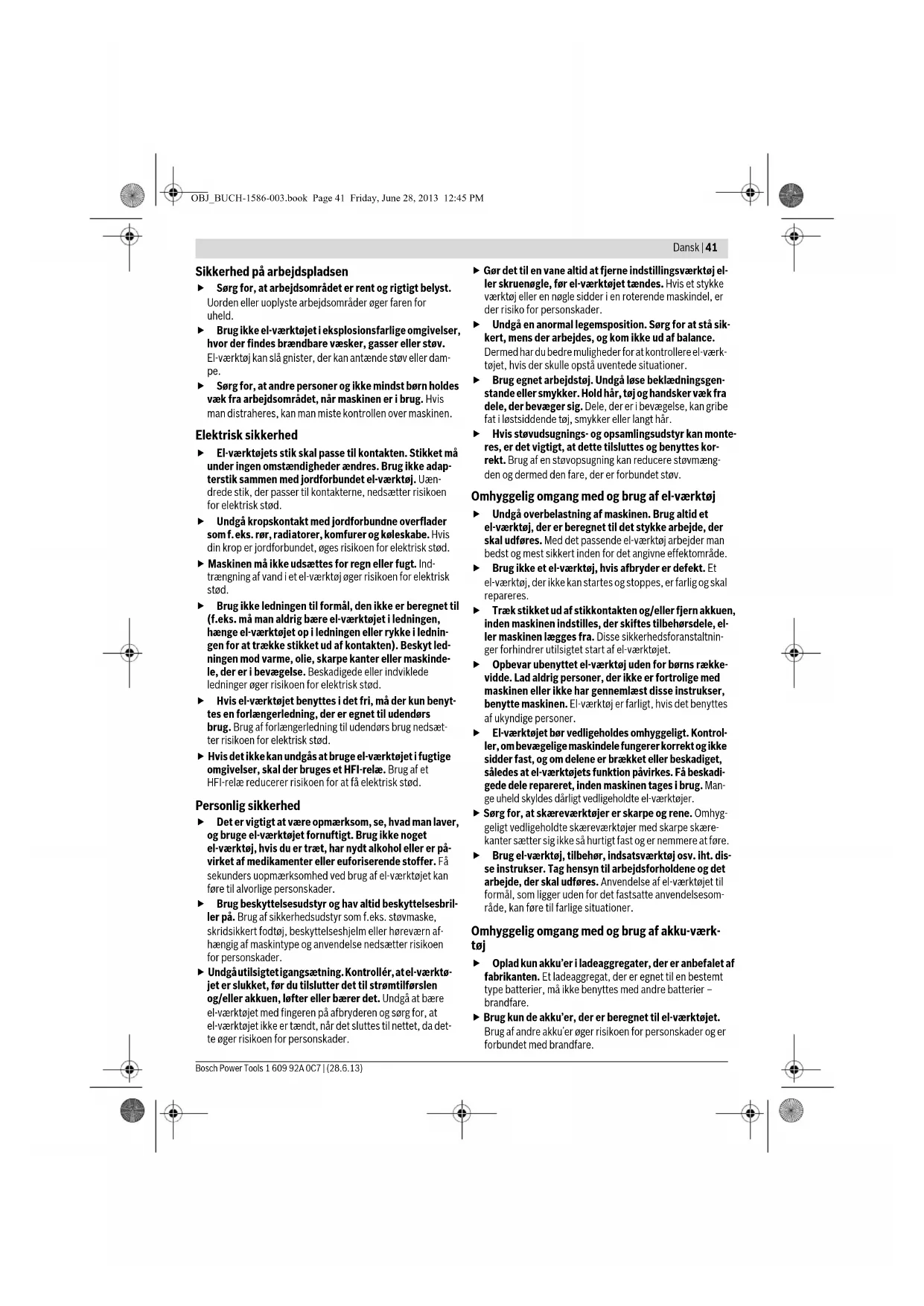 Totale trillingswaarde Henk Becker Executive Vice President Engineering Helmut Heinzelmann Head of Product Certification PT/ETM9 Symbool Betekenis OBJ_BUCH-1586-003.book Page 38 Friday, June 28, 2013 12:45 PMNederlands | 39 Bosch Power Tools 1 609 92A 0C7 | (28.6.13) Informatie over geluid en trillingen De meetwaarden van het product staan vermeld in de tabel op pagina 155. Geluids- en totale trillingswaarden (vectorsom van drie rich- tingen) bepaald volgens EN 60745. Het in deze gebruiksaanwijzing vermelde trillingsniveau is ge- meten met een volgens EN 60745 genormeerde meetmetho- de en kan worden gebruikt om elektrische gereedschappen met elkaar te vergelijken. Het is ook geschikt voor een voorlo- pige inschatting van de trillingsbelasting. Het aangegeven trillingsniveau representeert de voornaam- ste toepassingen van het elektrische gereedschap. Als echter het elektrische gereedschap wordt gebruikt voor andere toe- passingen, met afwijkende inzetgereedschappen of onvol- doende onderhoud, kan het trillingsniveau afwijken. Dit kan de trillingsbelasting gedurende de gehele arbeidsperiode dui- delijk verhogen. Voor een nauwkeurige schatting van de trillingsbelasting moet ook rekening worden gehouden met de tijd waarin het gereedschap uitgeschakeld is, of waarin het gereedschap wel loopt, maar niet werkelijk wordt gebruikt. Dit kan de trillings- belasting gedurende de gehele arbeidsperiode duidelijk ver- minderen. Leg aanvullende veiligheidsmaatregelen ter bescherming van de bediener tegen het effect van trillingen vast, zoals: Onder- houd van elektrische gereedschappen en inzetgereedschap- pen, warm houden van de handen, organisatie van het ar- beidsproces. Montage en gebruik De volgende tabel toont de handelingsdoelen voor montage en gebruik van het elektrische gereedschap. De aanwijzingen van de handelingsdoelen worden in de aangegeven afbeelding getoond. Naargelang de aard van de toepassing zijn verschillende com- binaties van de aanwijzingen vereist. Neem de veiligheidsvoorschriften in acht. Handelingsdoel Afbeelding Neem het volgende in acht Pagina Accu verwijderen 1 156 Accu plaatsen 2 156 Inzetgereedschap monteren 3 156 Draairichting instellen 4 157 Draaimoment vooraf instellen 5 157 Boorstand kiezen 6 158 OBJ_BUCH-1586-003.book Page 39 Friday, June 28, 2013 12:45 PM40 | Dansk 1 609 92A 0C7 | (28.6.13) Bosch Power Tools Onderhoud en reiniging Houd het elektrische gereedschap en de ventilatieope- ningen altijd schoon om goed en veilig te werken. Maak na elk gebruik het inzetgereedschap, de gereedschap- opname en de ventilatiesleuven van elektrische gereedschap schoon. Maak ook de ventilatiesleuven van de accu schoon. Klantenservice en gebruiksadviezen Onze klantenservice beantwoordt uw vragen over reparatie en onderhoud van uw product en over vervangingsonderde- len. Explosietekeningen en informatie over vervangingson- derdelen vindt u ook op: www.bosch-pt.com Het Bosch-team voor gebruiksadviezen helpt u graag bij vra- gen over onze producten en toebehoren. Vermeld bij vragen en bestellingen van vervangingsonderde- len altijd het uit tien cijfers bestaande productnummer vol- gens het typeplaatje van het elektrische gereedschap. Nederland Tel.: (076) 579 54 54 Fax: (076) 579 54 94 E-mail: gereedschappen@nl.bosch.com België Tel.: (02) 588 0589 Fax: (02) 588 0595 E-mail: outillage.gereedschap@be.bosch.com Vervoer Op de meegeleverde lithiumionaccu’s zijn de eisen voor het vervoer van gevaarlijke stoffen van toepassing. De accu’s kun- nen door de gebruiker zonder verdere voorwaarden over de weg worden vervoerd. Bij de verzending door derden (bijv. luchtvervoer of expedi- tiebedrijf) moeten bijzondere eisen ten aanzien van verpak- king en markering in acht worden genomen. In deze gevallen moet bij de voorbereiding van de verzending een deskundige voor gevaarlijke goederen worden geraadpleegd. Verzend accu’s alleen als de behuizing onbeschadigd is. Plak blootliggende contacten af en verpak de accu zodanig dat de- ze niet in de verpakking beweegt. Neem ook eventuele overige nationale voorschriften in acht. Afvalverwijdering Elektrische gereedschappen, accu’s, toebehoren en verpakkingen moeten op een voor het milieu verant- woorde wijze worden hergebruikt. Gooi elektrische gereedschappen, accu’s en batterijen niet bij het huisvuil. Alleen voor landen van de EU: Volgens de Europese richtlijn 2012/19/EU moeten niet meer bruikbare elektrische ge- reedschappen en volgens de Europese richtlijn 2006/66/EG moeten defecte of le- ge accu’s en batterijen apart worden inge- zameld en op een voor het milieu verant- woorde wijze worden hergebruikt. Wijzigingen voorbehouden. Dansk Generelle sikkerhedsinstrukser til el-værktøj Læs alle sikkerhedsinstrukser og an- visninger. I tilfælde af manglende over- holdelse af sikkerhedsinstrukserne og anvisningerne er der ri- siko for elektrisk stød, brand og/eller alvorlige kvæstelser. Opbevar alle sikkerhedsinstrukser og anvisninger til se- nere brug. Det i sikkerhedsinstrukserne benyttede begreb „el-værktøj“ refererer til netdrevet el-værktøj (med netkabel) og akkudre- vet el-værktøj (uden netkabel). Mechanische toerentalkeuze 7 158 In- en uitschakelen 8 158 Toebehoren kiezen – 159 Handelingsdoel Afbeelding Neem het volgende in acht Pagina ADVARSEL OBJ_BUCH-1586-003.book Page 40 Friday, June 28, 2013 12:45 PMDansk | 41 Bosch Power Tools 1 609 92A 0C7 | (28.6.13) Sikkerhed på arbejdspladsen Sørg for, at arbejdsområdet er rent og rigtigt belyst. Uorden eller uoplyste arbejdsområder øger faren for uheld. Brug ikke el-værktøjet i eksplosionsfarlige omgivelser, hvor der findes brændbare væsker, gasser eller støv. El-værktøj kan slå gnister, der kan antænde støv eller dam- pe. Sørg for, at andre personer og ikke mindst børn holdes væk fra arbejdsområdet, når maskinen er i brug. Hvis man distraheres, kan man miste kontrollen over maskinen. Elektrisk sikkerhed El-værktøjets stik skal passe til kontakten. Stikket må un