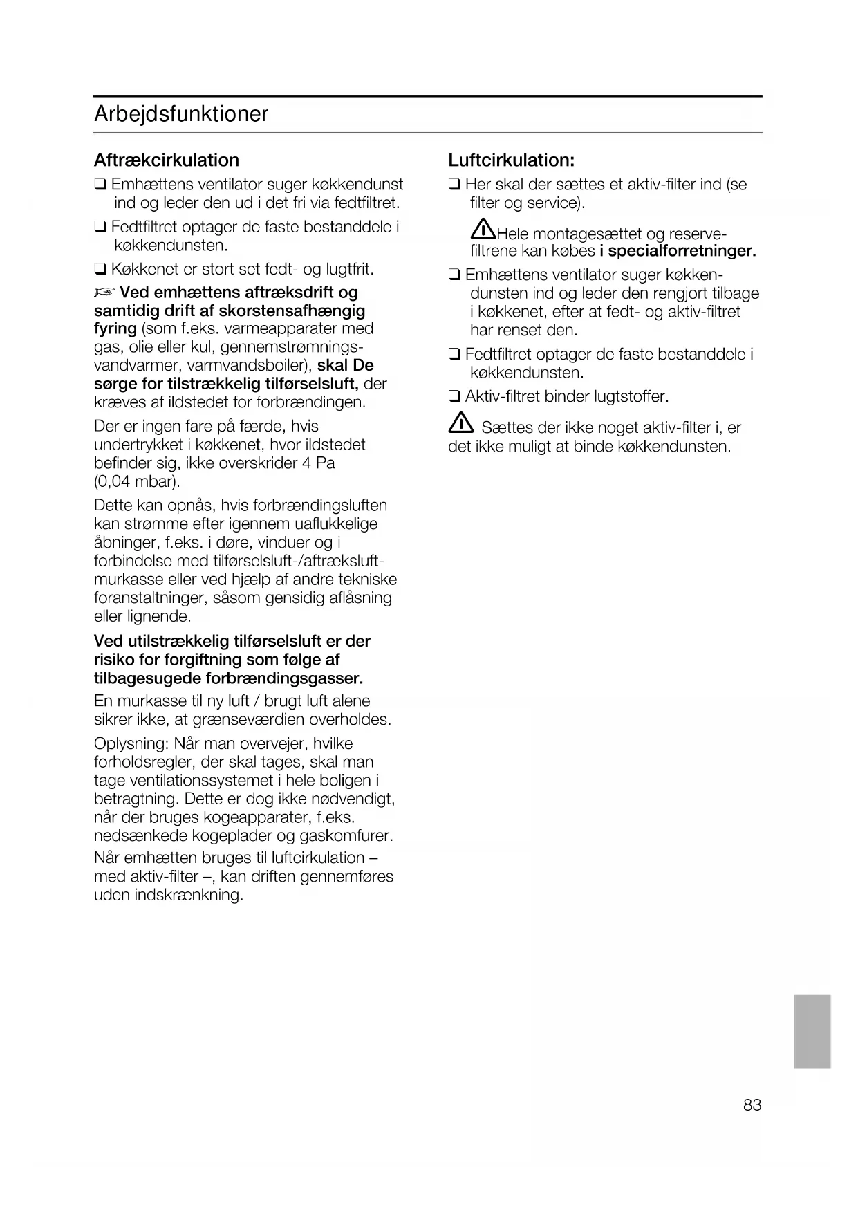 Ved emhættens aftræksdrift og samtidig drift af skorstensafhængig fyring (som f.eks. varmeapparater med gas, olie eller kul, gennemstrømnings- vandvarmer, varmvandsboiler), skal De sørge for tilstrækkelig tilførselsluft, der kræves af ildstedet for forbrændingen. Der er ingen fare på færde, hvis undertrykket i køkkenet, hvor ildstedet befinder sig, ikke overskrider 4 Pa (0,04 mbar). Dette kan opnås, hvis forbrændingsluften kan strømme efter igennem uaflukkelige åbninger, f.eks. i døre, vinduer og i forbindelse med tilførselsluft-/aftræksluft- murkasse eller ved hjælp af andre tekniske foranstaltninger, såsom gensidig aflåsning eller lignende. Ved utilstrækkelig tilførselsluft er der risiko for forgiftning som følge af tilbagesugede forbrændingsgasser. En murkasse til ny luft / brugt luft alene sikrer ikke, at grænseværdien overholdes. Oplysning: Når man overvejer, hvilke forholdsregler, der skal tages, skal man tage ventilationssystemet i hele boligen i betragtning. Dette er dog ikke nødvendigt, når der bruges kogeapparater, f.eks. nedsænkede kogeplader og gaskomfurer. Når emhætten bruges til luftcirkulation – med aktiv-filter –, kan driften gennemføres uden indskrænkning. Luftcirkulation: ❑ Her skal der sættes et aktiv-filter ind (se filter og service). Hele montagesættet og reserve- filtrene kan købes i specialforretninger. ❑ Emhættens ventilator suger køkken- dunsten ind og leder den rengjort tilbage i køkkenet, efter at fedt- og aktiv-filtret har renset den. ❑ Fedtfiltret optager de faste bestanddele i køkkendunsten. ❑ Aktiv-filtret binder lugtstoffer. Sættes der ikke noget aktiv-filter i, er det ikke muligt at binde køkkendunsten.84 Inden emhætten tages i brug for første gang Vigtige henvisninger: ❑ Denne brugsanvisning gælder for flere modeller. Det kan være, at specielle udstyrsdetaljer er beskrevet, som ikke findes på din emhætte. ❑ Denne emhætte opfylder de gældende sikkerhedsbestemmelser. Reparationer må kun udføres af fagfolk. Ufagligt udførte reparationer kan være til stor fare for den, der benytter apparatet. ❑ Du skal have læst brugsanvisningen grundigt igennem, før emhætten tages i brug. Den indeholder vigtige oplysninger om sikkerhed, brug og pleje. ❑ Opbevar brugsanvisningen et sikkert sted. Den kan være nyttig, hvis em hætten overtages af andre. Nedsænkede kogeplader med gas / gaskomfurer Brug ikke alle gas-kogeplader på en gang i lang tid (maks. 15 minutter) ved højeste varmebelastning, da overfladerne bliver varme og der derved er fare for forbrænding, hvis man berører overfladerne, eller fare for beskadigelse af emhætten. Er emhætten monteret over en gas- kogeplade, skal emhætten være indstillet på maks., hvis tre eller flere kogeplader bruges på samme tid. ❑ Dette apparat er klassificeret iht. det europæiske direktiv 2002/96/EF om affald af elektrisk- og elektronisk udstyr (waste electrical and electronic equipment – WEEE). Dette direktiv angiver rammerne for indlevering og recycling af kasserede apparater gældende for hele EU.