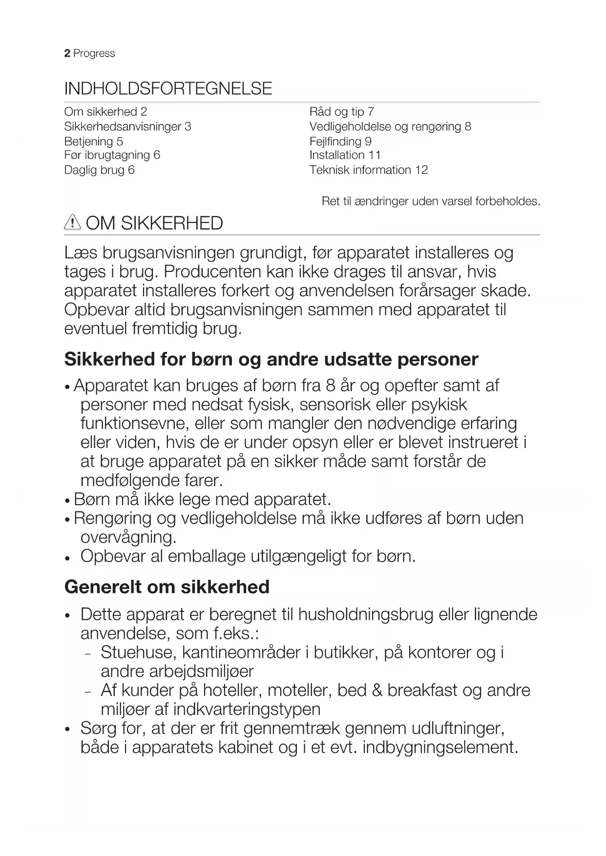 PG0853 Brugsanvisning Gebruiksaanwijzing User Manual Notice d'utilisation Fryser Vriezer Freezer CongélateurINDHOLDSFORTEGNELSE Om sikkerhed 2 Sikkerhedsanvisninger 3 Betjening 5 Før ibrugtagning 6 Daglig brug 6 Råd og tip 7 Vedligeholdelse og rengøring 8 Fejlfinding 9 Installation 11 Teknisk information 12 Ret til ændringer uden varsel forbeholdes. OM SIKKERHED Læs brugsanvisningen grundigt, før apparatet installeres og tages i brug. Producenten kan ikke drages til ansvar, hvis apparatet installeres forkert og anvendelsen forårsager skade. Opbevar altid brugsanvisningen sammen med apparatet til eventuel fremtidig brug. Sikkerhed for børn og andre udsatte personer