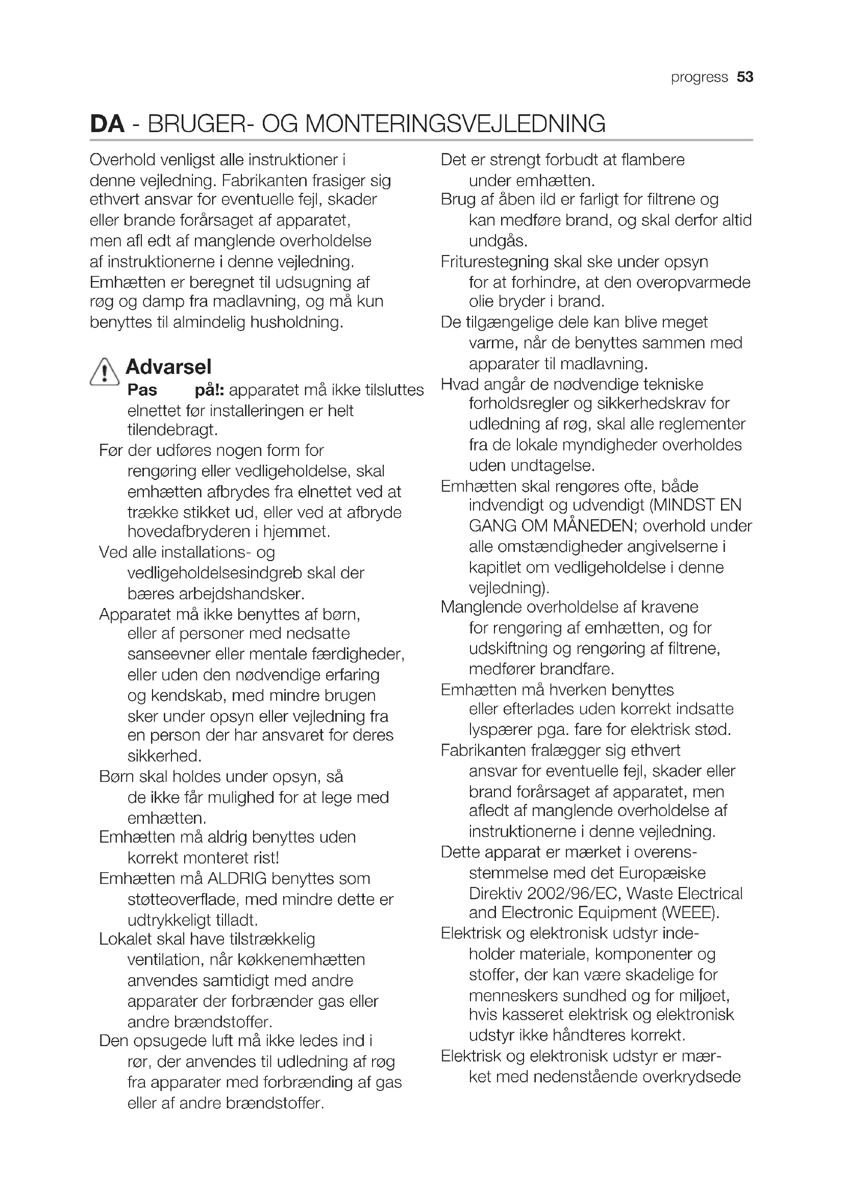 Overhold venligst alle instruktioner i denne vejledning. Fabrikanten frasiger sig ethvert ansvar for eventuelle fejl, skader eller brande forårsaget af apparatet, men afl edt af manglende overholdelse af instruktionerne i denne vejledning. Emhætten er beregnet til udsugning af røg og damp fra madlavning, og må kun benyttes til almindelig husholdning. Advarsel Pas på!: apparatet må ikke tilsluttes elnettet før installeringen er helt tilendebragt. Før der udføres nogen form for rengøring eller vedligeholdelse, skal emhætten afbrydes fra elnettet ved at trække stikket ud, eller ved at afbryde hovedafbryderen i hjemmet. Ved alle installations- og vedligeholdelsesindgreb skal der bæres arbejdshandsker. Apparatet må ikke benyttes af børn, eller af personer med nedsatte sanseevner eller mentale færdigheder, eller uden den nødvendige erfaring og kendskab, med mindre brugen sker under opsyn eller vejledning fra en person der har ansvaret for deres sikkerhed. Børn skal holdes under opsyn, så de ikke får mulighed for at lege med emhætten. Emhætten må aldrig benyttes uden korrekt monteret rist! Emhætten må ALDRIG benyttes som støtteoverflade, med mindre dette er udtrykkeligt tilladt. Lokalet skal have tilstrækkelig ventilation, når køkkenemhætten anvendes samtidigt med andre apparater der forbrænder gas eller andre brændstoffer. Den opsugede luft må ikke ledes ind i rør, der anvendes til udledning af røg fra apparater med forbrænding af gas eller af andre brændstoffer. Det er strengt forbudt at flambere under emhætten. Brug af åben ild er farligt for filtrene og kan medføre brand, og skal derfor altid undgås. Friturestegning skal ske under opsyn for at forhindre, at den overopvarmede olie bryder i brand. De tilgængelige dele kan blive meget varme, når de benyttes sammen med apparater til madlavning. Hvad angår de nødvendige tekniske forholdsregler og sikkerhedskrav for udledning af røg, skal alle reglementer fra de lokale myndigheder overholdes uden undtagelse. Emhætten skal rengøres ofte, både indvendigt og udvendigt (MINDST EN GANG OM MÅNEDEN; overhold under alle omstændigheder angivelserne i kapitlet om vedligeholdelse i denne vejledning). Manglende overholdelse af kravene for rengøring af emhætten, og for udskiftning og rengøring af filtrene, medfører brandfare. Emhætten må hverken benyttes eller efterlades uden korrekt indsatte lyspærer pga. fare for elektrisk stød. Fabrikanten fralægger sig ethvert ansvar for eventuelle fejl, skader eller brand forårsaget af apparatet, men afledt af manglende overholdelse af instruktionerne i denne vejledning. Dette apparat er mærket i overens- stemmelse med det Europæiske Direktiv 2002/96/EC, Waste Electrical and Electronic Equipment (WEEE). Elektrisk og elektronisk udstyr inde- holder materiale, komponenter og stoffer, der kan være skadelige for menneskers sundhed og for miljøet, hvis kasseret elektrisk og elektronisk udstyr ikke håndteres korrekt. Elektrisk og elektronisk udstyr er mær- ket med nedenstående overkrydsede54 progress skraldespand . Den symboliserer, at elektrisk og elektronisk udstyr ikke må bortskaffes sammen med usorteret husholdningsaffald, men indsamles særskilt. Alle kommuner har etableret indsamlingsordninger, hvor elektrisk og elektronisk udstyr gratis kan afleveres af borgerne på genbrugsstationer og andre indsamlingssteder eller bliver afhentet direkte fra husholdningerne. Nærmere information kan fås hos kommunens tekniske forvaltning. Brug Emhætten er udviklet til brug i den sugende udgave med ekstern udledning eller i den fi ltrerende udgave med intern recirkula- tion . Installering Produkt med meget stor vægt, fl ytning og montering af emhætten skal foretages af mindst to eller fl ere personer. Minimumsafstanden mellem kogegrejets støtteoverfl ade på komfuret og den nederste del af emhætten må ikke være under 50cm ved elektriske kogeplader, og ikke under 65cm ved gasblus eller komfurer med både gasblus og elektriske kogeplader. Hvis gaskomfurets vejledning angiver en større afstand, skal dette overholdes. Netspændingen skal svare til spændingen vist på typeskiltet internt i emhætten. Hvis emhætten er udstyret med et stik, skal emhætten tilsluttes en let tilgængelig stikkontakt, der er i overensstemmelse med de gældende standarder. Stikkontakten skal også være let tilgængelig efter installeringen. Hvis emhætten ikke er udstyret med et stik (direkte tilslutning til elnettet), eller hvis stikket ikke fi ndes i et område, der også er let tilgængeligt efter installeringen, skal der monteres en topolet afbryderkontakt i overensstemmelse med standarderne, der sørger for fuld afbrydelse fra elnettet i tilfælde af forhold i overspændingskategori III, og i overensstemmelse med reglerne for elektriske installationer. Obs! Undersøg altid, at netkablet er blevet monteret rigtigt, før emhættens kredsløb tilsluttes forsyningsnettet og der udføres kontrol af korrekt funktion. Funktion Emhætten er udstyret med et betjeningspanel med mulighed for regulering af sugestyrken og lys til oplysning af kogeområdet. 1 2-3
