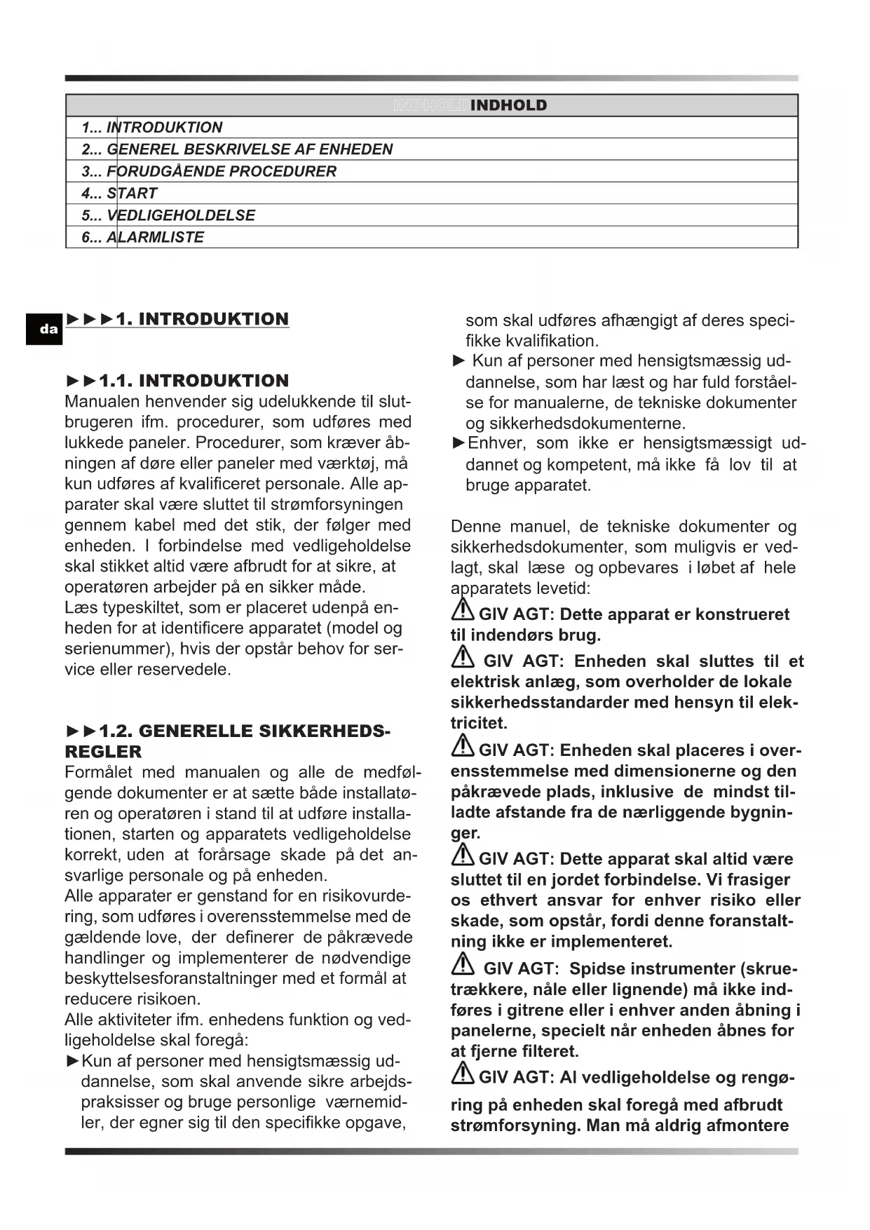 4... START 5... VEDLIGEHOLDELSE 6... ALARMLISTE ►►►1. INTRODUKTION ►►1.1. INTRODUKTION Manualen henvender sig udelukkende til slut- brugeren ifm. procedurer, som udføres med lukkede paneler. Procedurer, som kræver åb- ningen af døre eller paneler med værktøj, må kun udføres af kvaliceret personale. Alle ap- parater skal være sluttet til strømforsyningen gennem kabel med det stik, der følger med enheden. I forbindelse med vedligeholdelse skal stikket altid være afbrudt for at sikre, at operatøren arbejder på en sikker måde. Læs typeskiltet, som er placeret udenpå en- heden for at identicere apparatet (model og serienummer), hvis der opstår behov for ser- vice eller reservedele. ►►1.2. GENERELLE SIKKERHEDS- REGLER Formålet med manualen og alle de medføl- gende dokumenter er at sætte både installatø- ren og operatøren i stand til at udføre installa- tionen, starten og apparatets vedligeholdelse korrekt, uden at forårsage skade på det an- svarlige personale og på enheden. Alle apparater er genstand for en risikovurde- ring, som udføres i overensstemmelse med de gældende love, der denerer de påkrævede handlinger og implementerer de nødvendige beskyttelsesforanstaltninger med et formål at reducere risikoen. Alle aktiviteter ifm. enhedens funktion og ved- ligeholdelse skal foregå: ►Kun af personer med hensigtsmæssig ud- dannelse, som skal anvende sikre arbejds- praksisser og bruge personlige værnemid- ler, der egner sig til den specikke opgave, som skal udføres afhængigt af deres speci- kke kvalikation. ► Kun af personer med hensigtsmæssig ud- dannelse, som har læst og har fuld forståel- se for manualerne, de tekniske dokumenter og sikkerhedsdokumenterne. ►Enhver, som ikke er hensigtsmæssigt ud- dannet og kompetent, må ikke få lov til at bruge apparatet. Denne manuel, de tekniske dokumenter og sikkerhedsdokumenter, som muligvis er ved- lagt, skal læse og opbevares i løbet af hele apparatets levetid: GIV AGT: Dette apparat er konstrueret til indendørs brug. GIV AGT: Enheden skal sluttes til et elektrisk anlæg, som overholder de lokale sikkerhedsstandarder med hensyn til elek- tricitet. GIV AGT: Enheden skal placeres i over- ensstemmelse med dimensionerne og den påkrævede plads, inklusive de mindst til- ladte afstande fra de nærliggende bygnin- ger. GIV AGT: Dette apparat skal altid være sluttet til en jordet forbindelse. Vi frasiger os ethvert ansvar for enhver risiko eller skade, som opstår, fordi denne foranstalt- ning ikke er implementeret. GIV AGT: Spidse instrumenter (skrue- trækkere, nåle eller lignende) må ikke ind- føres i gitrene eller i enhver anden åbning i panelerne, specielt når enheden åbnes for at fjerne lteret. GIV AGT: Al vedligeholdelse og rengø- ring på enheden skal foregå med afbrudt strømforsyning. Man må aldrig afmontereen