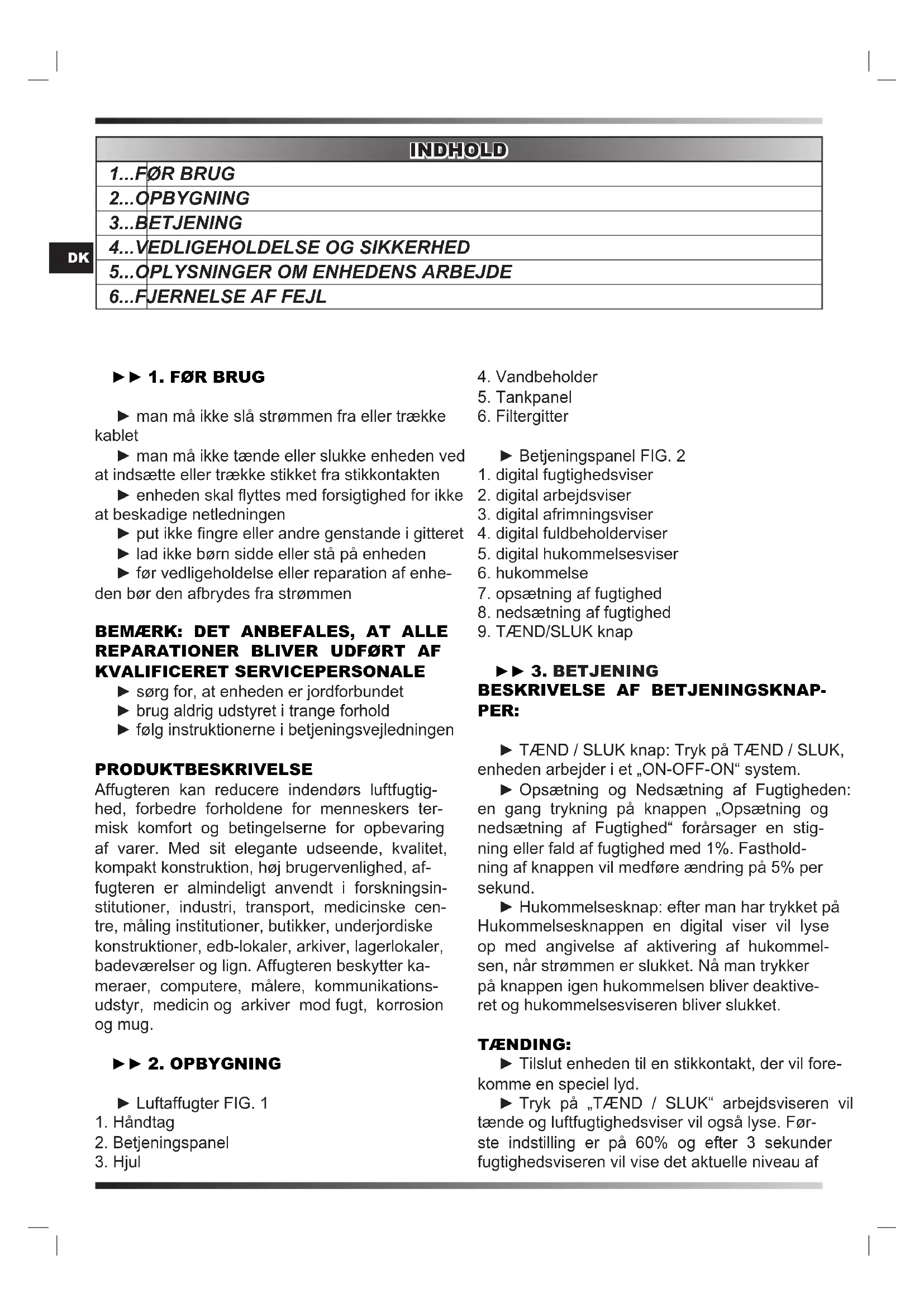 KVALIFICERET SERVICEPERSONALE ► sørg for, at enheden er jordforbundet ► brug aldrig udstyret i trange forhold ► følg instruktionerne i betjeningsvejledningen PRODUKTBESKRIVELSE Affugteren kan reducere indendørs luftfugtig- hed, forbedre forholdene for menneskers ter- misk komfort og betingelserne for opbevaring af varer. Med sit elegante udseende, kvalitet, kompakt konstruktion, høj brugervenlighed, af- fugteren er almindeligt anvendt i forskningsin- stitutioner, industri, transport, medicinske cen- tre, måling institutioner, butikker, underjordiske konstruktioner, edb-lokaler, arkiver, lagerlokaler, badeværelser og lign. Affugteren beskytter ka- meraer, computere, målere, kommunikations- udstyr, medicin og arkiver mod fugt, korrosion og mug. ► 2. OPbYGNING ► Luftaffugter FIG. 1