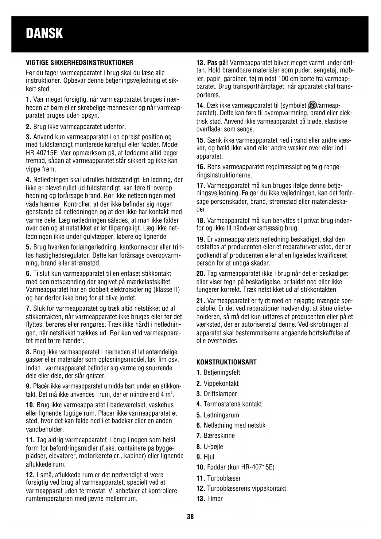 VIGTIGE SIKKERHEDSINSTRUKTIONER Før du tager varmeapparatet i brug skal du læse alle instruktioner. Opbevar denne betjeningsvejledning et sik- kert sted.