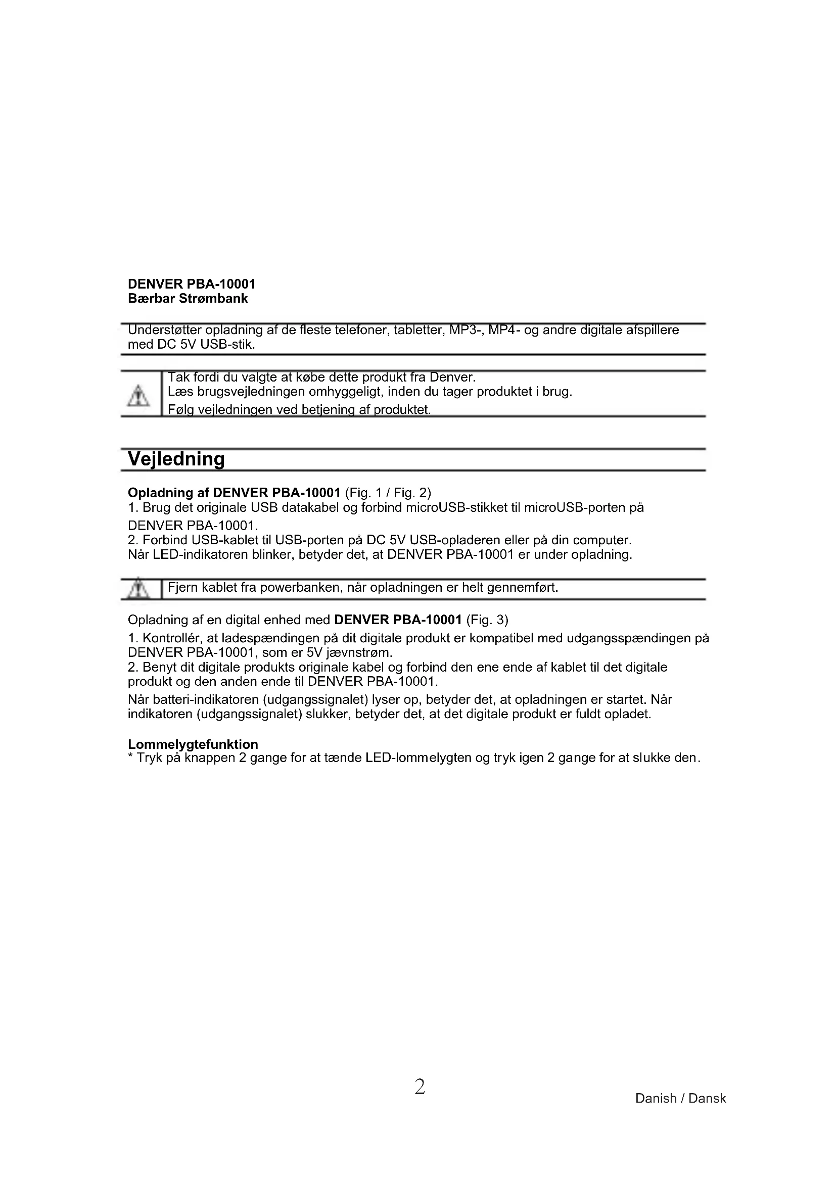 - Kontroller, at ladespaendingen på dit digitale produit er kompatibel med udgangsspaendingen på DENVER PBA-10001, som er 5V jævnstrøm.