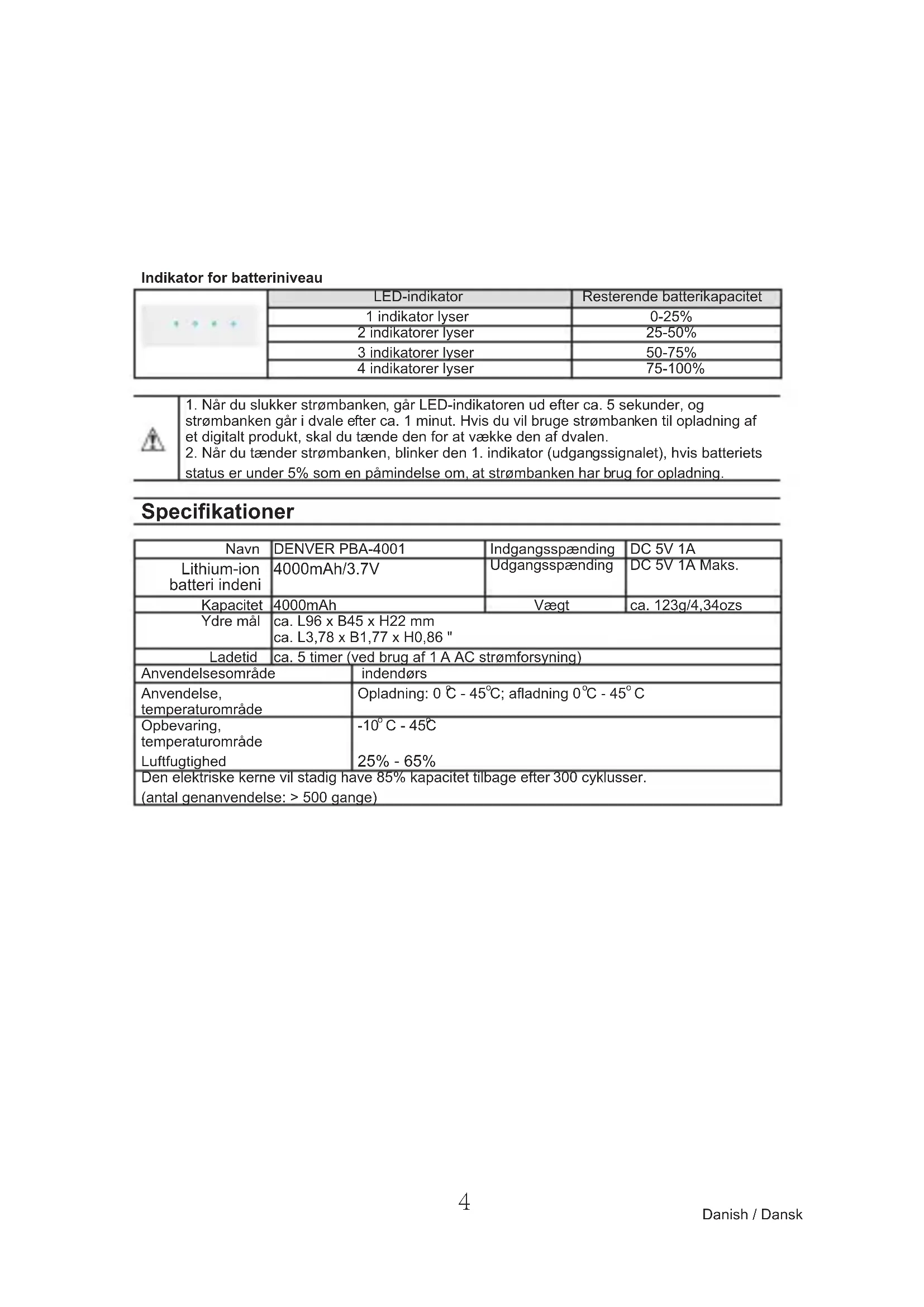 status er under 5% som en påmindelse om, at strømbanken har brug for opladning. Specifikationer Navn DENVER PBA-4001 Indgangsspænding DC 5V 1A Lithium-ion batteri indeni 4000mAh/3.7V Udgangsspænding DC 5V 1A Maks. Kapacitet 4000mAh Vægt ca. 123g/4,34ozs Ydre mål ca. L96 x B45 x H22 mm ca. L3,78 x B1,77 x H0,86 " Ladetid ca. 5 timer (ved brug af 1 A AC strømforsyning) Anvendelsesområde indendørs Anvendelse, temperaturområde Opladning: 0