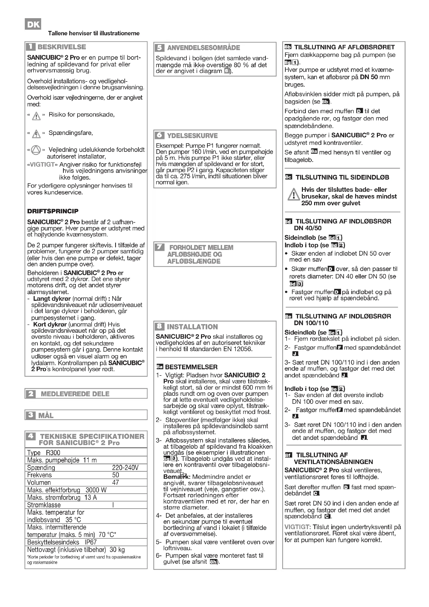 2 Pro er en pumpe til bort- ledning af spildevand for privat eller erhvervsmæssig brug. Overhold installations- og vedligehol- delsesvejledningen i denne brugsanvisning. Overhold især vejledningerne, der er angivet med: