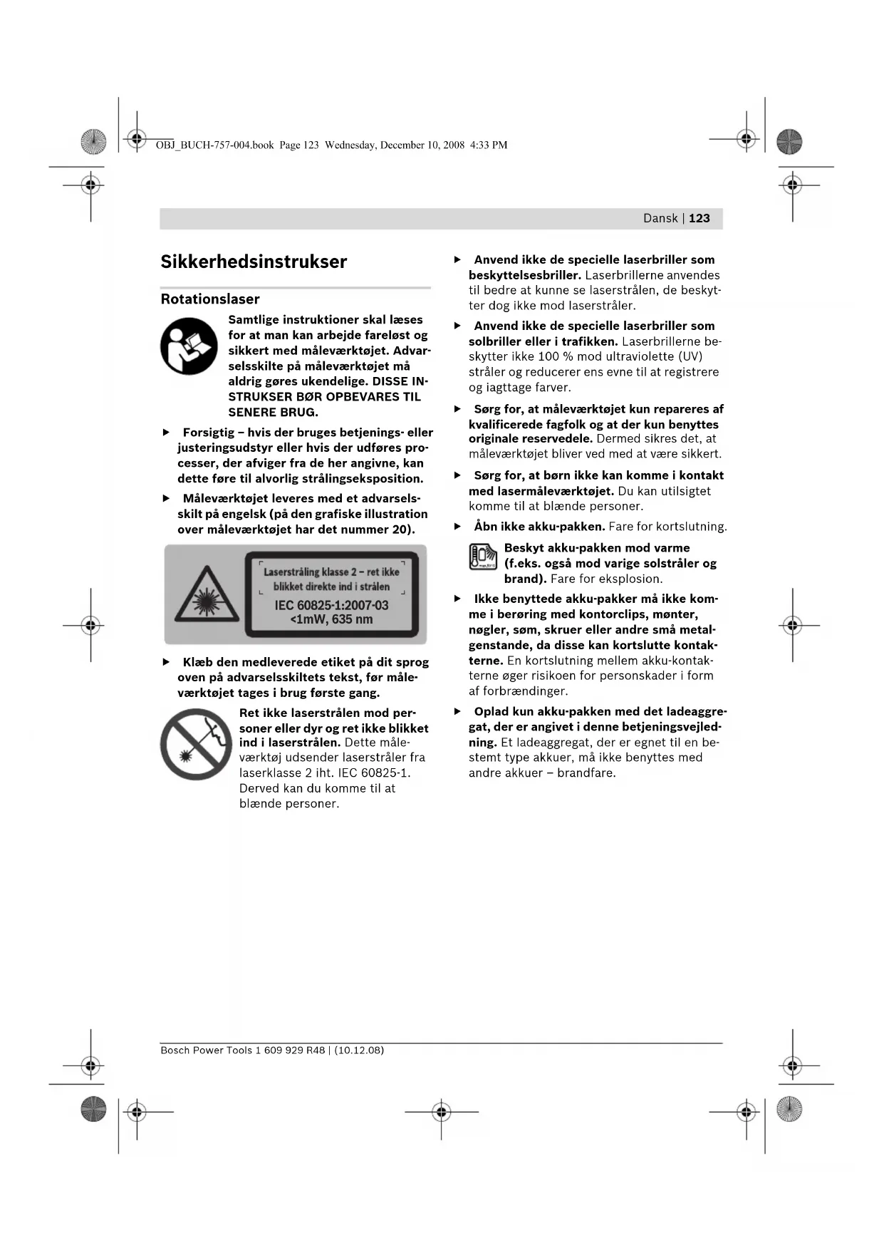 Sikkerhedsinstrukser Rotationslaser Samtlige instruktioner skal læses for at man kan arbejde fareløst og sikkert med måleværktøjet. Advar- selsskilte på måleværktøjet må aldrig gøres ukendelige. DISSE IN-