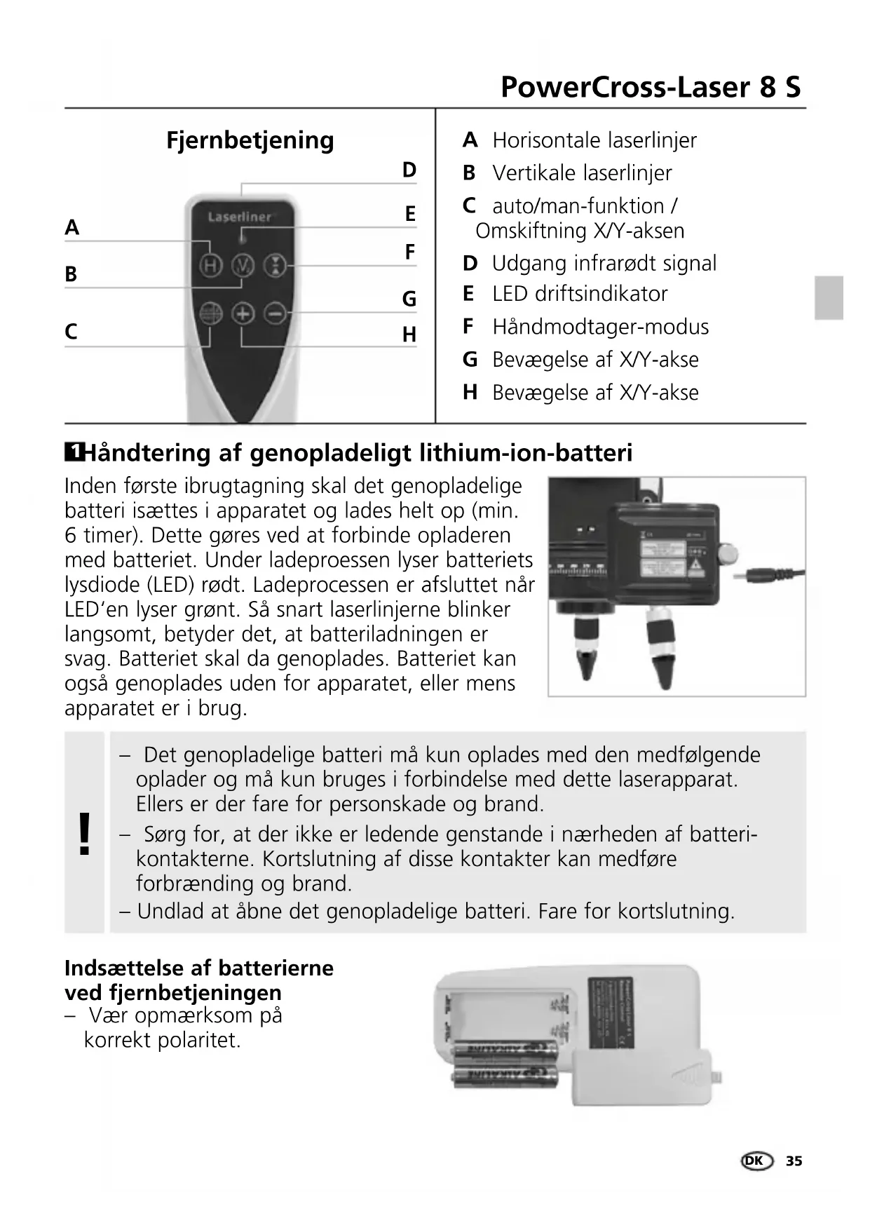 Bevægelse af X/Y-akse Inden første ibrugtagning skal det genopladelige batteri isættes i apparatet og lades helt op (min. 6 timer). Dette gøres ved at forbinde opladeren med batteriet. Under ladeproessen lyser batteriets lysdiode (LED) rødt. Ladeprocessen er afsluttet når LED‘en lyser grønt. Så snart laserlinjerne blinker langsomt, betyder det, at batteriladningen er svag. Batteriet skal da genoplades. Batteriet kan også genoplades uden for apparatet, eller mens apparatet er i brug. Indsættelse af batterierne ved fjernbetjeningen – Vær opmærksom på korrekt polaritet. Håndtering af genopladeligt lithium-ion-batteri Fjernbetjening – Det genopladelige batteri må kun oplades med den medfølgende oplader og må kun bruges i forbindelse med dette laserapparat. Ellers er der fare for personskade og brand. – Sørg for, at der ikke er ledende genstande i nærheden af batteri- kontakterne. Kortslutning af disse kontakter kan medføre forbrænding og brand. – Undlad at åbne det genopladelige batteri. Fare for kortslutning. !36