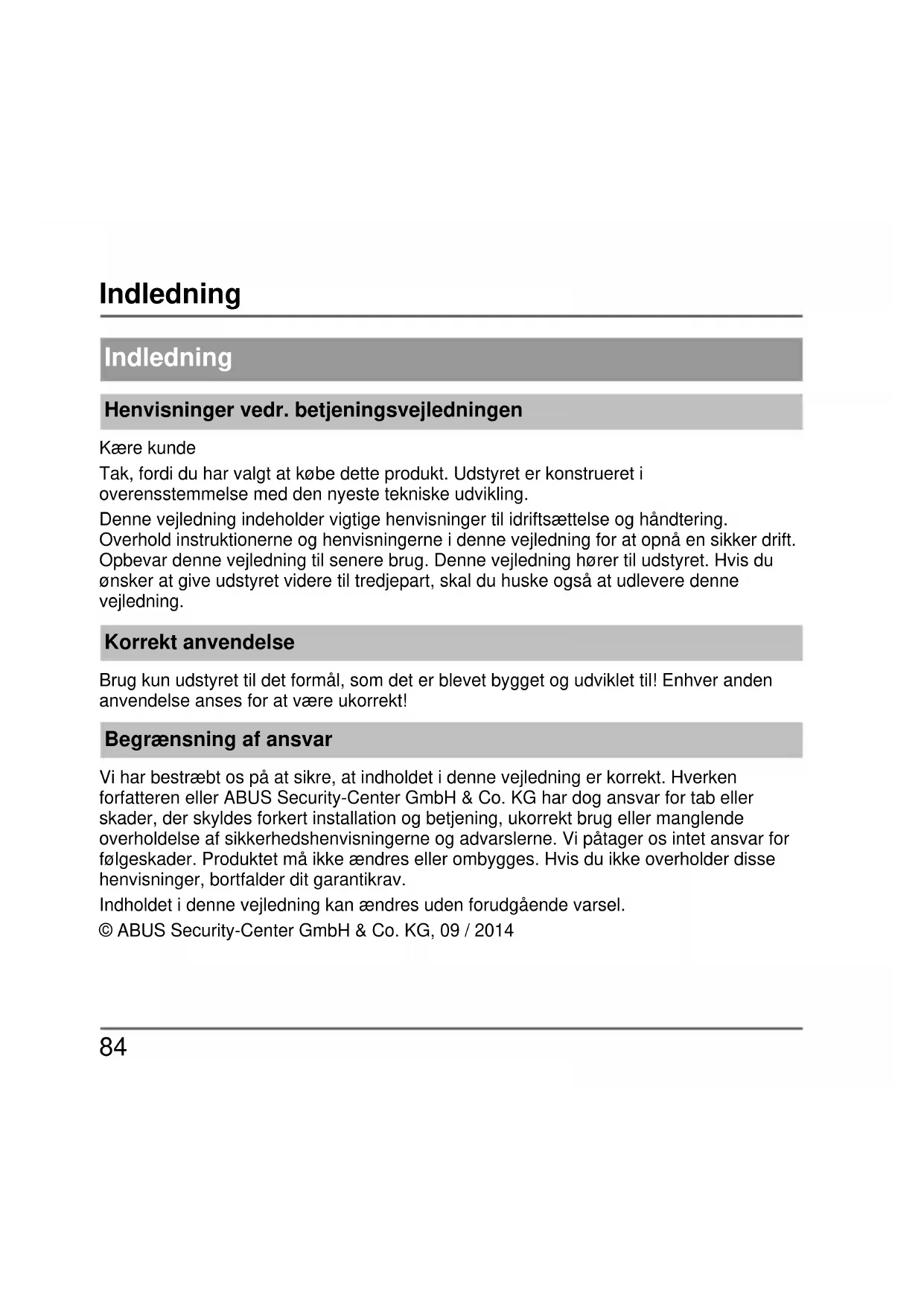 Indledning Henvisninger vedr. betjeningsvejledningen Kære kunde Tak, fordi du har valgt at købe dette produkt. Udstyret er konstrueret i overensstemmelse med den nyeste tekniske udvikling. Denne vejledning indeholder vigtige henvisninger til idriftsættelse og håndtering. Overhold instruktionerne og henvisningerne i denne vejledning for at opnå en sikker drift. Opbevar denne vejledning til senere brug. Denne vejledning hører til udstyret. Hvis du ønsker at give udstyret videre til tredjepart, skal du huske også at udlevere denne vejledning. Korrekt anvendelse Brug kun udstyret til det formål, som det er blevet bygget og udviklet til! Enhver anden anvendelse anses for at være ukorrekt! Begrænsning af ansvar Vi har bestræbt os på at sikre, at indholdet i denne vejledning er korrekt. Hverken forfatteren eller ABUS Security-Center GmbH & Co. KG har dog ansvar for tab eller skader, der skyldes forkert installation og betjening, ukorrekt brug eller manglende overholdelse af sikkerhedshenvisningerne og advarslerne. Vi påtager os intet ansvar for følgeskader. Produktet må ikke ændres eller ombygges. Hvis du ikke overholder disse henvisninger, bortfalder dit garantikrav. Indholdet i denne vejledning kan ændres uden forudgående varsel. © ABUS Security-Center GmbH & Co. KG, 09 / 2014Sikkerhedshenvisninger