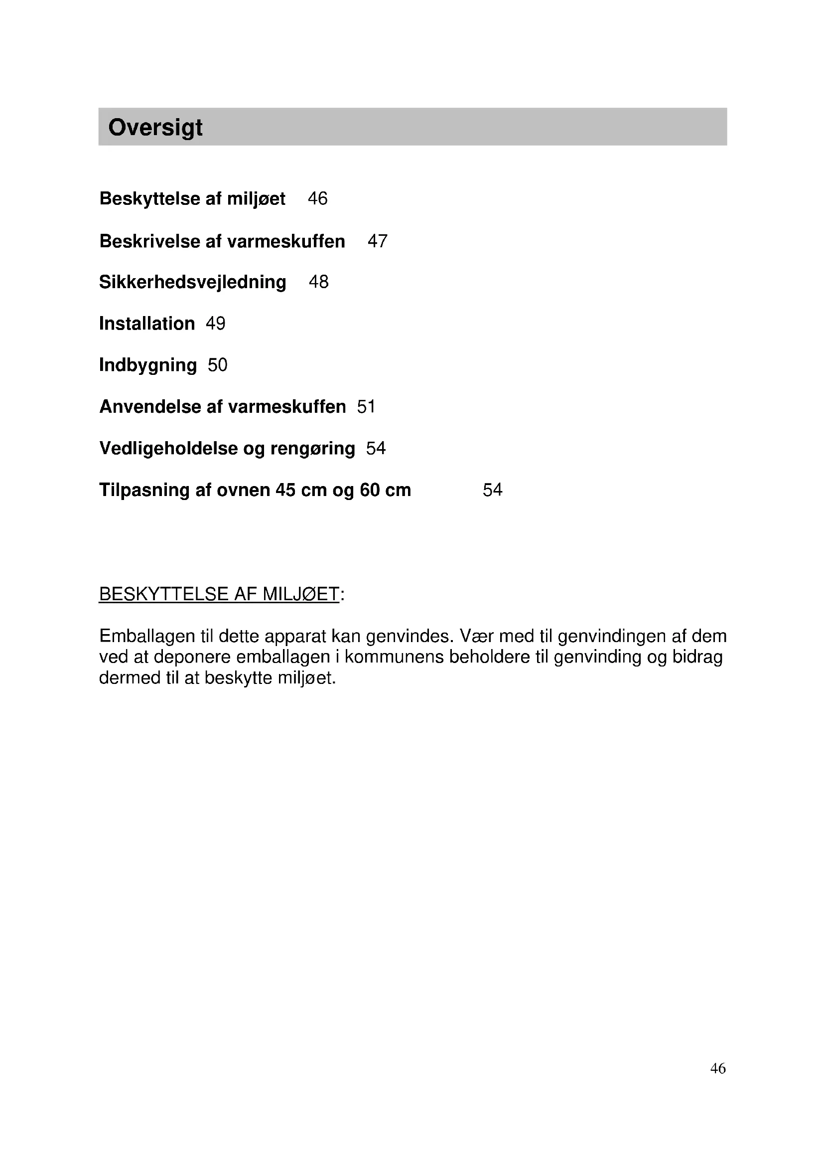 Beskyttelse af miljøet 46 Beskrivelse af varmeskuffen 47 Sikkerhedsvejledning 48 Installation 49 Indbygning 50 Anvendelse af varmeskuffen 51 Vedligeholdelse og rengøring 54 Tilpasning af ovnen 45 cm og 60 cm 54