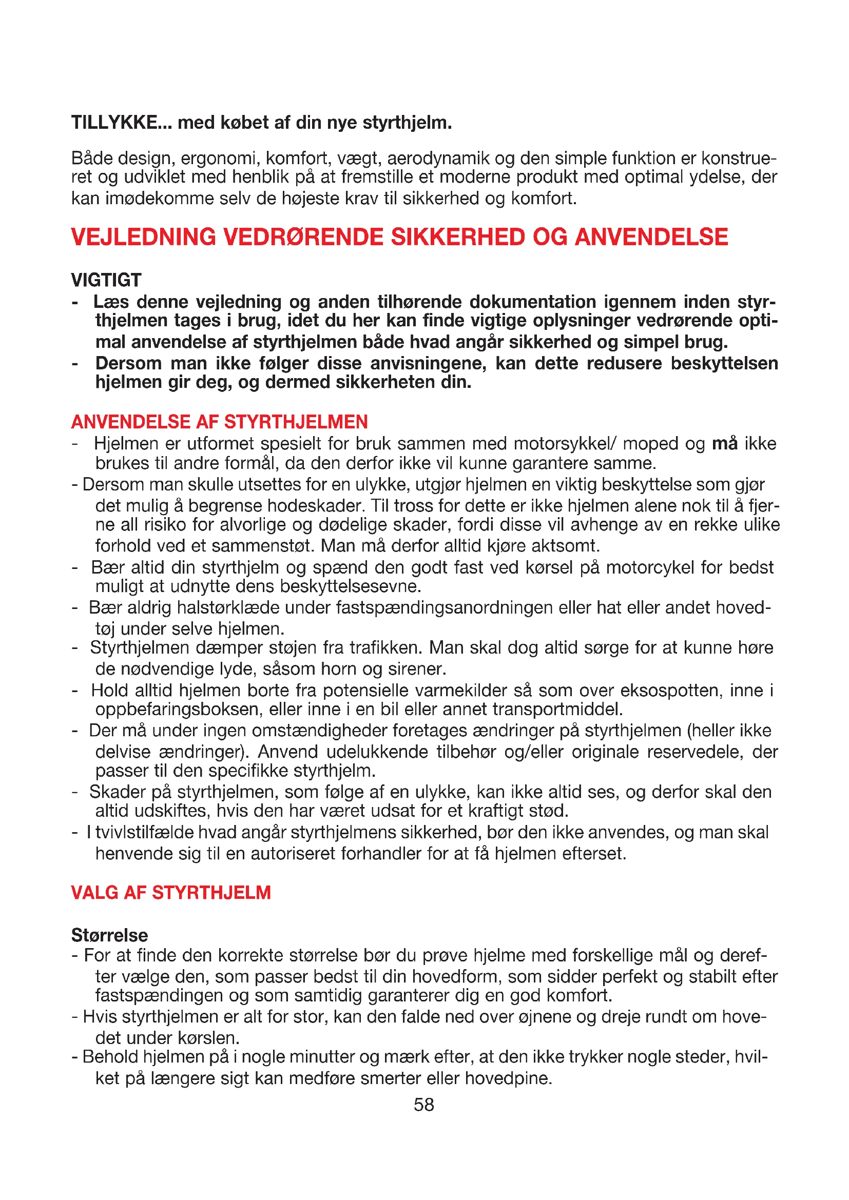 - Hjelmen er utformet spesielt for bruk sammen med motorsykkel/ moped og må ikke brukes til andre formål, da den derfor ikke vil kunne garantere samme. - Dersom man skulle utsettes for en ulykke, utgjør hjelmen en viktig beskyttelse som gjør det mulig å begrense hodeskader. Til tross for dette er ikke hjelmen alene nok til å fjer- ne all risiko for alvorlige og dødelige skader, fordi disse vil avhenge av en rekke ulike forhold ved et sammenstøt. Man må derfor alltid kjøre aktsomt. - Bær altid din styrthjelm og spænd den godt fast ved kørsel på motorcykel for bedst muligt at udnytte dens beskyttelsesevne. - Bær aldrig halstørklæde under fastspændingsanordningen eller hat eller andet hoved- tøj under selve hjelmen. - Styrthjelmen dæmper støjen fra trafikken. Man skal dog altid sørge for at kunne høre de nødvendige lyde, såsom horn og sirener. - Hold alltid hjelmen borte fra potensielle varmekilder så som over eksospotten, inne i oppbefaringsboksen, eller inne i en bil eller annet transportmiddel. - Der må under ingen omstændigheder foretages ændringer på styrthjelmen (heller ikke delvise ændringer). Anvend udelukkende tilbehør og/eller originale reservedele, der passer til den specifikke styrthjelm. - Skader på styrthjelmen, som følge af en ulykke, kan ikke altid ses, og derfor skal den altid udskiftes, hvis den har været udsat for et kraftigt stød. - I tvivlstilfælde hvad angår styrthjelmens sikkerhed, bør den ikke anvendes, og man skal henvende sig til en autoriseret forhandler for at få hjelmen efterset.