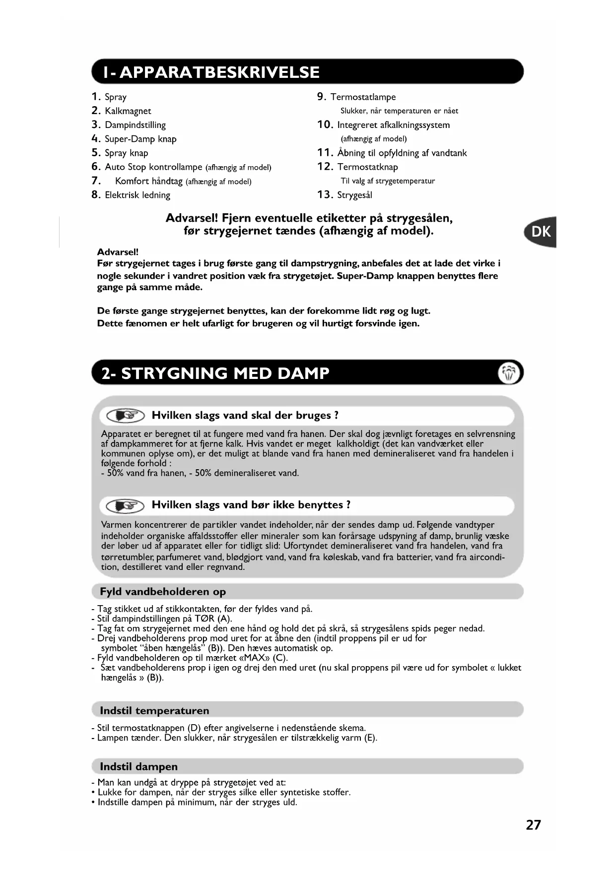 Hvilken slags vand skal der bruges ? Apparatet er beregnet til at fungere med vand fra hanen. Der skal dog jævnligt foretages en selvrensningaf dampkammeret for at fjerne kalk. Hvis vandet er meget kalkholdigt (det kan vandværket eller kommunen oplyse om), er det muligt at blande vand fra hanen med demineraliseret vand fra handelen i følgende forhold :- 50% vand fra hanen, - 50% demineraliseret vand. Hvilken slags vand bør ikke benyttes ? Varmen koncentrerer de partikler vandet indeholder, når der sendes damp ud. Følgende vandtyper indeholder organiske affaldsstoffer eller mineraler som kan forårsage udspyning af damp, brunlig væske der løber ud af apparatet eller for tidligt slid: Ufortyndet demineraliseret vand fra handelen, vand fra tørretumbler, parfumeret vand, blødgjort vand, vand fra køleskab, vand fra batterier, vand fra aircondi- tion, destilleret vand eller regnvand.Advarsel! Før strygejernet tages i brug første gang til dampstrygning, anbefales det at lade det virke i nogle sekunder i vandret position væk fra strygetøjet. Super-Damp knappen benyttes fleregange på samme måde.De første gange strygejernet benyttes, kan der forekomme lidt røg og lugt.Dette fænomen er helt ufarligt for brugeren og vil hurtigt forsvinde igen. Advarsel! Fjern eventuelle etiketter på strygesålen, før strygejernet tændes (afhængig af model).