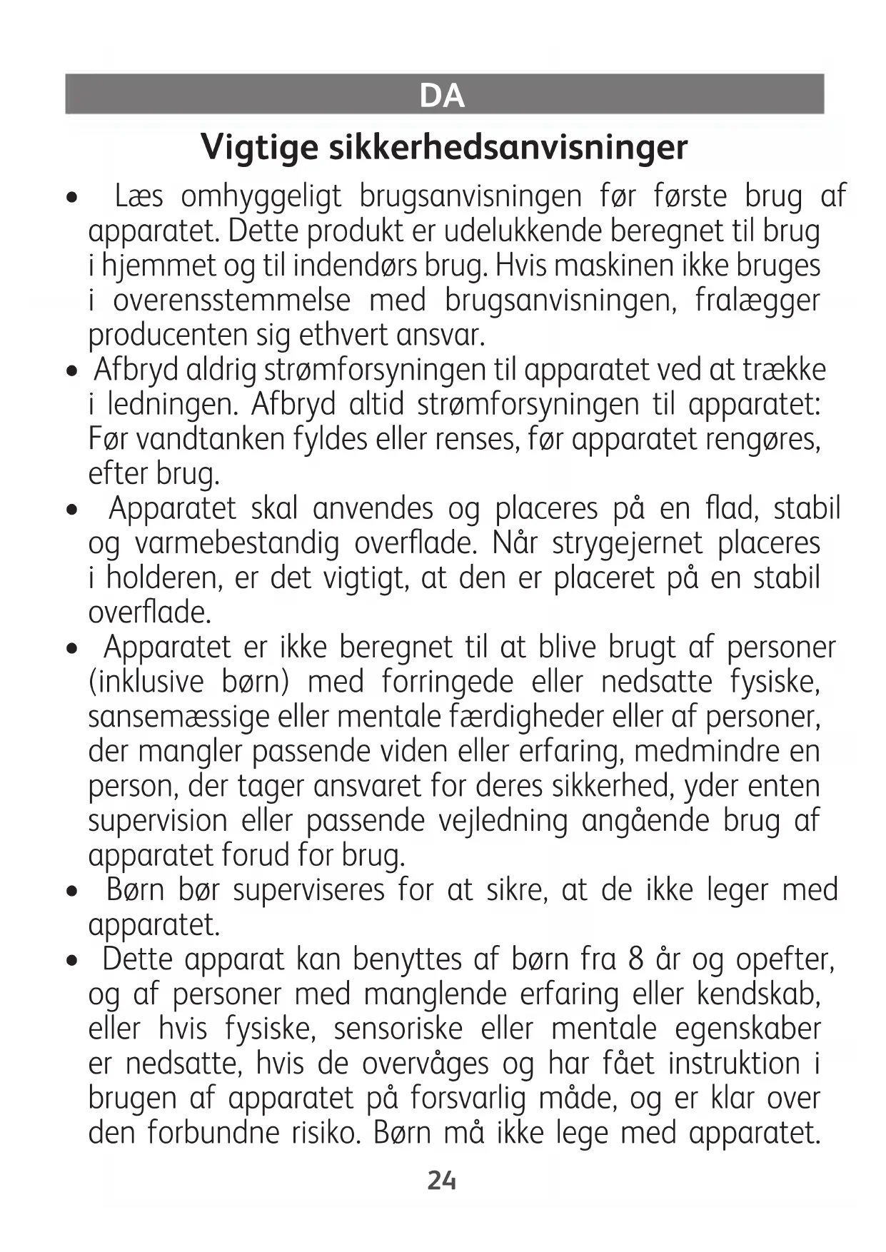 - Dette apparat kan benyttes af børn fra 8 år og opefter, og af personer med manglende erfaring eller kendskab, eller hvis fysiske, sensoriske eller mentale egenskaber er nedsatte, hvis de overvåges og har fået instruktion i brugen af apparatet på forsvarlig måde, og er klar over den forbundne risiko. Børn må ikke lege med apparatet. 24Rengøring og vedligeholdelse må ikke udføres af børn, hvis de ikke er under opsyn. Hold strygejernet og det tilhørende kabel væk fra børn under 8 år, når det varmer op eller køler af.