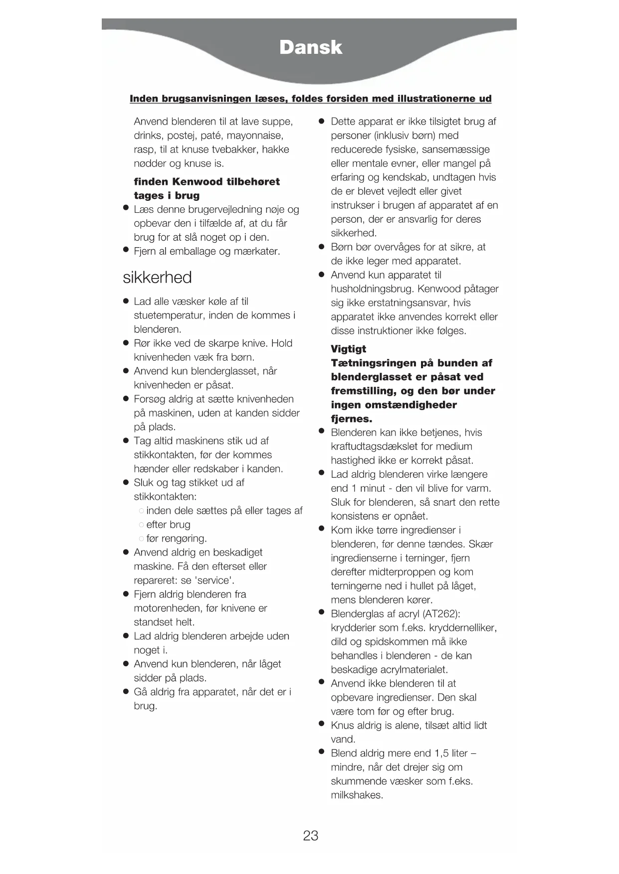 Anvend kun apparatet til husholdningsbrug. Kenwood påtager sig ikke erstatningsansvar, hvis apparatet ikke anvendes korrekt eller disse instruktioner ikke følges. Vigtigt Tætningsringen på bunden af blenderglasset er påsat ved fremstilling, og den bør under ingen omstændigheder fjernes.