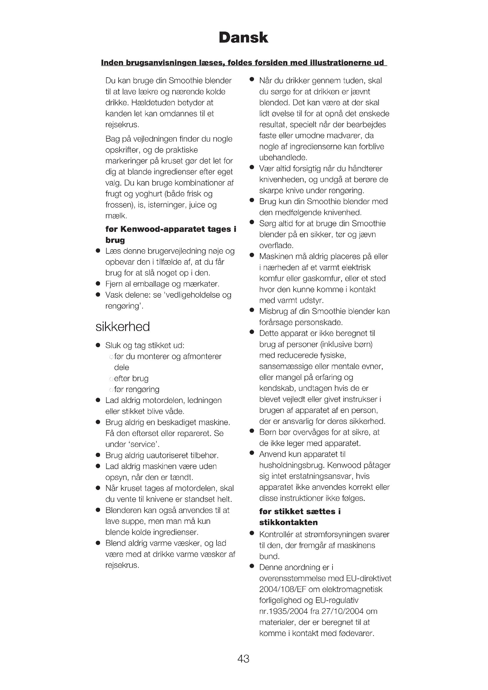 Anvend kun apparatet til husholdningsbrug. Kenwood påtager sig intet erstatningsansvar, hvis apparatet ikke anvendes korrekt eller disse instruktioner ikke følges. før stikket sættes i stikkontakten