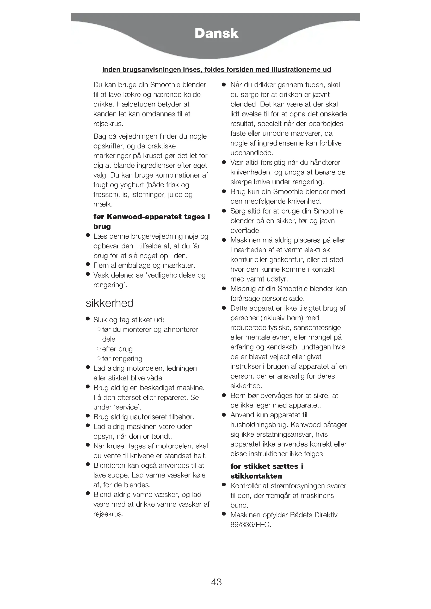 Anvend kun apparatet til husholdningsbrug. Kenwood påtager sig ikke erstatningsansvar, hvis apparatet ikke anvendes korrekt eller disse instruktioner ikke følges. før stikket sættes i stikkontakten