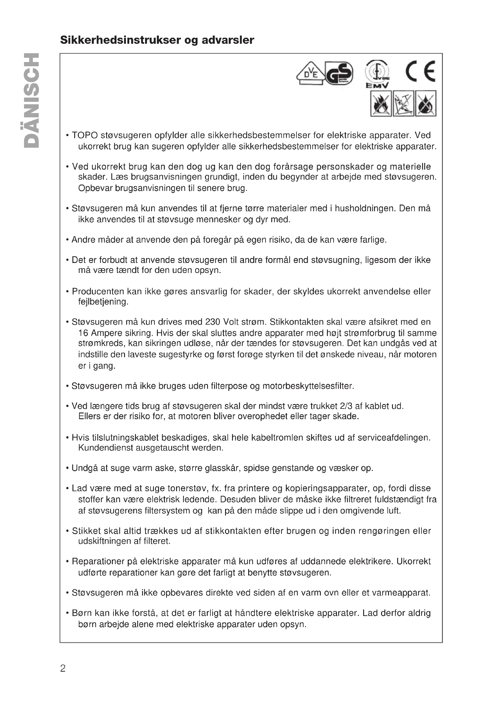 - TOPO støvsugeren opfylder alle sikkerhedsbestemmelser for elektriske apparater. Ved ukorrekt brug kan sugeren opfylder alle sikkerhedsbestemmelser for elektriske apparater.