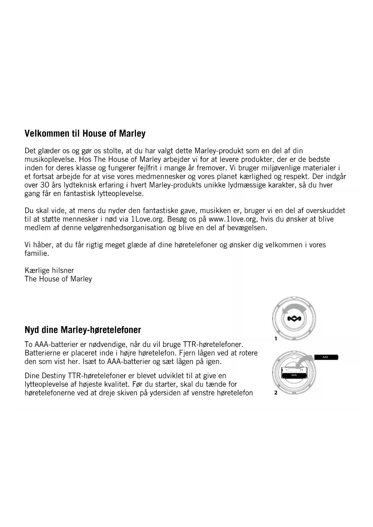 2på ”On”. Der tændes et lille lys for at vise, at høretelefonerne er på og klar til brug. Teknologien inde i dine TTR-høretelefoner udelukker aktivt uønsket støj udefra og giver din musik de detaljer og den styrke, den fortjener. Dine Destiny Trenchtown Work-høretelefoner kommer med to ledninger. Den ene bruges til at lytte med på farten og når du bruger dine høretelefoner til at tale i telefon med. Den anden ledning er meget længere og bruges, når du lytter til musik fra en stationær enhed, der måske er længere væk. Hver ledning har en lige 3,5 mm kontakt på den side, der skal forbindes med input-stikket på undersiden af venstre høretelefon. Mikrofonkompatibilitet og en-knapstyring Med den integrerede mikrofon kan du føre håndfri samtaler. Tryk på knappen for at besvare et opkald. Tryk igen for at afslutte samtalen. Ansvarlig lytning Sørg for at skrue ned for lyden på din musikenhed, før du starter med at lytte. Det fjerner risikoen for at skade din høresans med for høj lydstyrke. Brug aldrig høretelefonerne, mens du betjener maskiner, kører bil eller foretager dig andet, hvor det er vigtigt at kunne høre udefrakommende lyde. Hvis du skulle opleve smerter eller ubehag, mens du bruger høretelefonerne eller bagefter, kan det skyldes, at lydstyrken er for høj, og forårsage varige høreskader. “O” Position “On” Position off onArbejdsmiljøagenturets (Occupational Safety and Health Administration = OSHA) retningslinjer for tilladte støjniveauer og eksponeringstider. Støjniveau (Sound Pressure Level = SPL) Maksimal anbefalet daglig eksponering 90dB 8 timer 92dB 6 timer 95dB 4 timer 100dB 2 timer 105dB 1 time 110dB 30 minutter 115dB 15 minutter Over 115 dB undgå støjniveau på 115 dB og derover Denne afmærkning angiver, at dette produkt ikke må bortskaffes med andet husholdningsaffald inden for EU. For at forhindre mulig skade for miljøet eller menneskers sundhed på grund af ukontrolleret affaldsbortskaffelse, skal det genanvendes på ansvarlig vis for at fremme den bæredygtige genanvendelse af materielle ressourcer. Gør brug af returnerings- og indsamlingssystemer eller kontakt den detailhandler, hvor produktet blev købt, for at returnere det brugte produkt. Disse kan videresende produktet til miljøsikker genanvendelse. WEEE forklaringTo års begrænset garanti House of Marley LLC garanterer, at dette produkts materiale og kvalitet er fejlfri i en periode på to år fra købsdatoen. Undtagelser er nævnt nedenfor. The House of Marley-produktgaranti dækker ikke skader på grund af ukorrekt brug eller misbrug, uheld, montering af ikke autoriseret tilbehør, ændringer på produktet eller andet, der ligger uden for The House of Marleys kontrol. Denne garanti gælder kun, hvis produktet er blevet købt og bruges i Storbritannien eller EU. Et produkt, der kræver ændringer eller tilpasninger for at kunne virke i et andet land end det land, som det er udviklet, fremstillet, godkendt eller autoriseret for; eller reparation af produkter, der er beskadiget af disse ændringer; er ikke dækket af denne garanti. The House of Marley LLC er ikke ansvarlig for tilfældige, følgende eller særlige skader af nogen art. For at opnå garantiservice for dit produkt skal du henvende dig til den forhandler, hvor produktet er blevet købt, sammen med kvitteringen, der er forsynet med dato (som bevis for købet). Efter modtagelsen reparerer eller udskifter forhandleren produktet, hvor det er relevant. Skulle du ikke være i stand til at henvende dig til forretningen, bedes du kontakte The House of Marleys kundetjeneste, tlf. +44 (0)203 441 1885 eller CS@ thehouseofmarley.co.uk. The House of Marley PO Box 460, Tonbridge Kent TN9 9EW, UK Serviceres dette produkt af andre end en forhandler for The House of Marley, bliver denne garanti ugyldig. Denne garanti påvirker ikke dine lovbestemte rettigheder. Flere oplysninger om vores produktsortiment findes på www.thebouseofmarley.com. Alle rettigheder forbeholdes.Hallo en welkom bij The House of Marley Wij zijn blij en vereerd dat je dit Marley-product hebt gekozen voor je muziekervaringen. Bij The House of Marley trachten wij de beste producten te leveren, die garant staan voor een jarenlange, foutloze werking op basis van milieuvriendelijke materialen, omdat we permanent blijk willen geven van liefde en respect voor onze medemens en onze planeet. Het unieke, kenmerkende geluid van elk Marley-product is het resultaat van meer dan dertig jaar ervaring in audio- engineering. Daardoor staat het elke keer opnieuw garant voor een verbluffende ervaring. We willen dat u weet dat, terwijl u dankzij uw Marley-koptelefoon geniet van het schitterende geschenk dat muziek is, wij een deel van de opbrengst aan minderbedeelden zullen schenken via 1Love.org. Om lid te worden van deze liefdadigheidsorganisatie en toe te treden tot de beweging kun je een kijkje nemen op www.1love.org. We hopen dat uw koptelefoon u veel genot zal bezorgen en wij heten u welkom in onze familie. Blessed Love, The House of Marley Geniet van je Marley-koptelefoon Om met uw TTR-koptelefoon naar muziek te luisteren, hebt u twee AAA- batterijen nodig. De batterijen moeten in de rechteroorschelp worden geplaatst. Neem het klepje weg door het te draaien, zoals hier wordt getoond. Plaats twee AAA-batterijen en breng het klepje weer op zijn plaats. Uw Destiny TTR-koptelefoon is ontworpen om de hoogste kwaliteit van luisterervaring te bieden. Schakel vóór het luisteren de koptelefoon AAA AAA