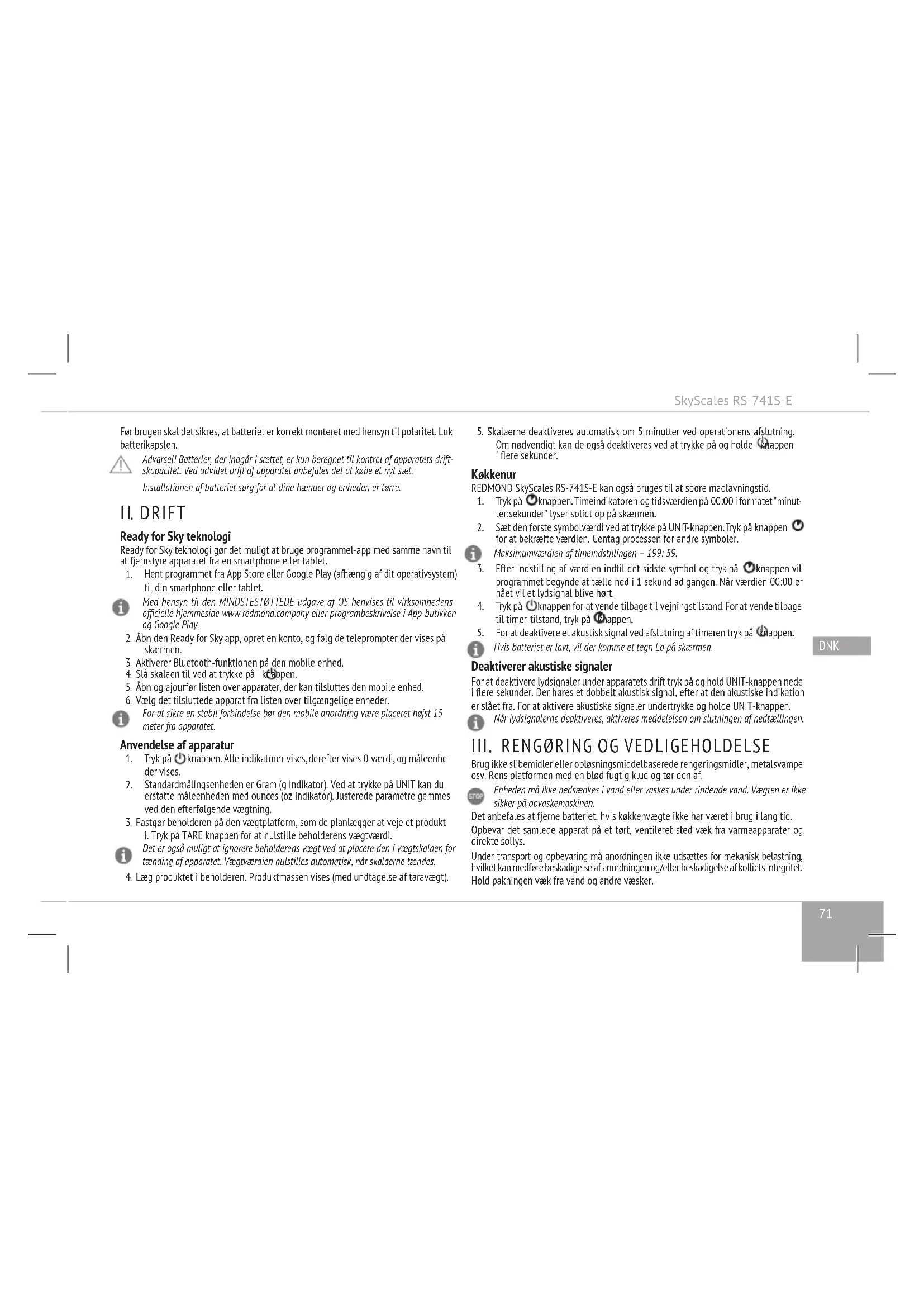 - Garantien er 1 år. Efter registreringen i Ready for Sky app gives der et ekstra år for gratis tjeneste. Oplysninger om betingelserne for dit land ndes på hjemmesiden https://r4s.redmond.company 1+1 garanti er tilgængelig for en liste over begrænsede lande. Miljøvenlig bortskaffelse (bortskaffelse af elektrisk og elektronisk udstyr) Bortskaffelse af emballage, manualer, samt selve enheden skal udføres i overensstemmelse med lokale genbrugsprogrammer. Vis hensyn til miljøet: smid ikke disse produkter med almindeligt husholdningsaffald. Brugt (gammelt) udstyr skal ikke bortskaffes sammen med usorteret hushold- ningsaffald, det skal bortskaffes særskilt. Gammelt udstyr skal bringes på et specielt indsamlingssted, eller videregives til relevante genbrugsorganisationer. På denne måde du med i forarbejdning af værdifulde råstoffer, samt bekæmpelse af forurening. Dette apparat er mærket i overensstem melse med det europæiske direktiv 2012/19/ EU — der omhandler kasserede, elektriske og elektroniske apparater (kasseret, elektrisk og elektronisk udstyr). Denne retningslinje fastsætter rammen for returnering og genbrug af kasserede appa- rater, der gælder i hele EU. Bluetooth er et registreret varemærke tilhørende Bluetooth SIG, Inc. App Store er et servicemærke tilhørende Apple Inc., registreret i USA og andre lande. Google Play er et registreret varemærke tilhørende Google Inc.SkyScales RS-741S-E