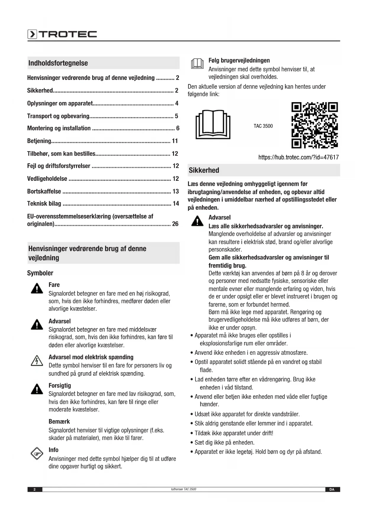- EU-overensstemmelseserklæring (oversættelse af originalen) Henvisninger vedrørende brug af denne vejledning Symboler Fare Signalordet betegner en fare med en høj risikograd, som, hvis den ikke forhindres, medfører døden eller alvorlige kvæstelser. Advarsel Signalordet betegner en fare med middelsvær risikograd, som, hvis den ikke forhindres, kan føre til døden eller alvorlige kvæstelser. Advarsel mod elektrisk spænding Dette symbol henviser til en fare for personers liv og sundhed på grund af elektrisk spænding. Forsigtig Signalordet betegner en fare med lav risikograd, som, hvis den ikke forhindres, kan føre til ringe eller moderate kvæstelser. Bemærk Signalordet henviser til vigtige oplysninger (f.eks. skader på materialer), men ikke til farer. Info Anvisninger med dette symbol hjælper dig til at udføre dine opgaver hurtigt og sikkert. Følg brugervejledningen Anvisninger med dette symbol henviser til, at vejledningen skal overholdes. Den aktuelle version af denne vejledning kan hentes under følgende link: TAC 3500 https://hub.trotec.com/?id=47617 Sikkerhed Læs denne vejledning omhyggeligt igennem før ibrugtagning/anvendelse af enheden, og opbevar altid vejledningen i umiddelbar nærhed af opstillingsstedet eller på enheden. Advarsel Læs alle sikkerhedsadvarsler og anvisninger. Manglende overholdelse af advarsler og anvisninger kan resultere i elektrisk stød, brand og/eller alvorlige personskader. Gem alle sikkerhedsadvarsler og anvisninger til fremtidig brug. Dette værktøj kan anvendes af børn på 8 år og derover og personer med nedsatte fysiske, sensoriske eller mentale evner eller manglende erfaring og viden, hvis de er under opsigt eller er blevet instrueret i brugen og farerne, som er forbundet hermed. Børn må ikke lege med apparatet. Rengøring og brugervedligeholdelse må ikke udføres af børn, der ikke er under opsyn. p. 26