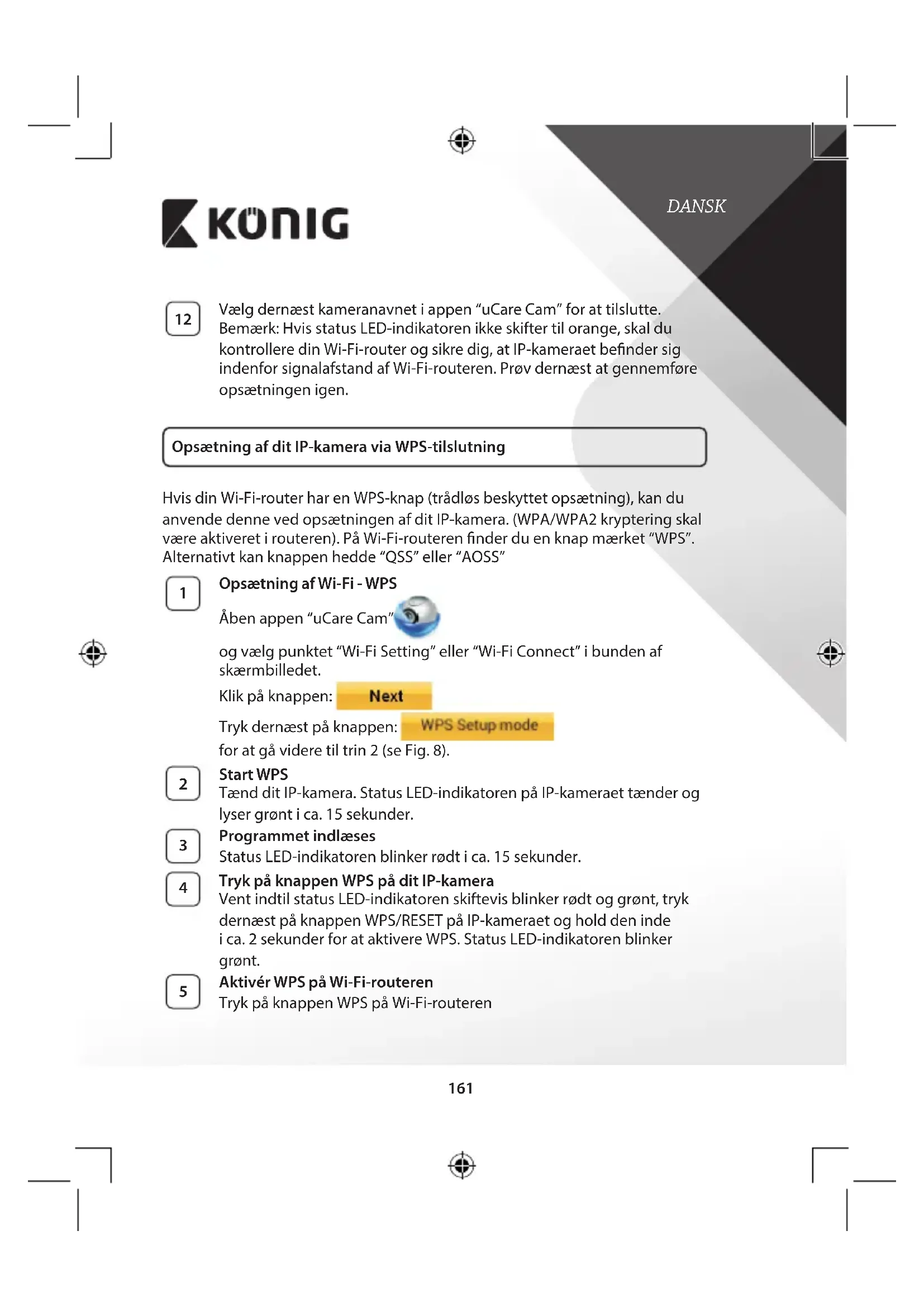 Vælgdernæstkameranavnetiappen“uCareCam”forattilslutte. Bemærk:HvisstatusLED-indikatorenikkeskiftertilorange,skaldu kontrolleredinWi-Fi-routerogsikredig,atIP-kameraetbendersig indenforsignalafstandafWi-Fi-routeren.Prøvdernæstatgennemføre opsætningenigen. Opsætning af dit IP‑kamera via WPS‑tilslutning HvisdinWi-Fi-routerharenWPS-knap(trådløsbeskyttetopsætning),kandu anvendedennevedopsætningenafditIP-kamera.(WPA/WPA2krypteringskal væreaktiveretirouteren).PåWi-Fi-routerennderduenknapmærket“WPS”. Alternativtkanknappenhedde“QSS”eller“AOSS”