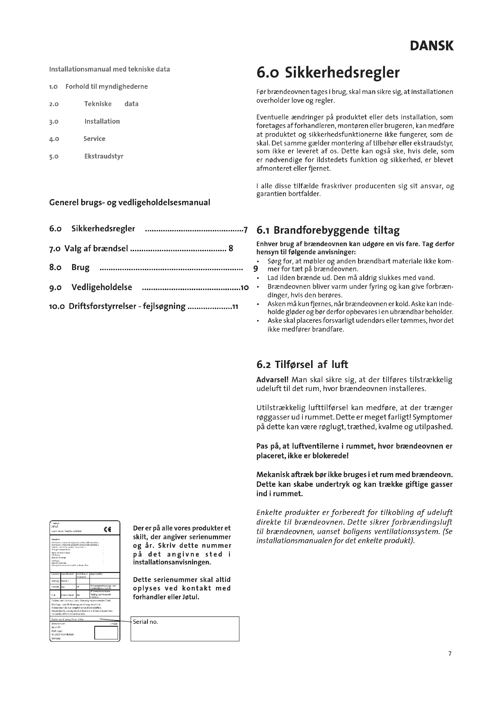 Serial no. Der er på alle vores produkter et skilt, der angiver serienummer og år. Skriv dette nummer på det angivne sted i installationsanvisningen. Dette serienummer skal altid oplyses ved kontakt med forhandler eller Jøtul.