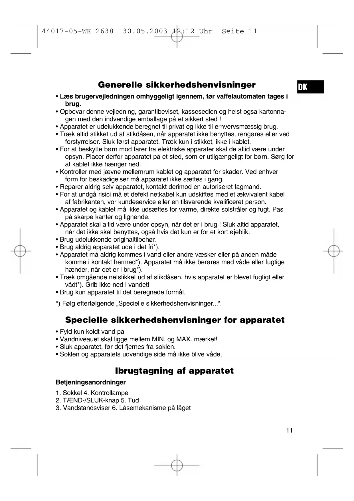 44017-05-WK 2638 30.05.2003 12:12 Uhr Seite 11Læs denne betjeningsvejledning omhyggeligt og opbevar den på et sikkert sted. Kog vand to gange i vandkedlen før den tages i brug første gang – brug kun klart vand uden tilsætningsmiddel. Ibrugtagning Kog vand to gange med frisk vand – uden tilsætningsmiddel – før apparatet tages i brug første gang.