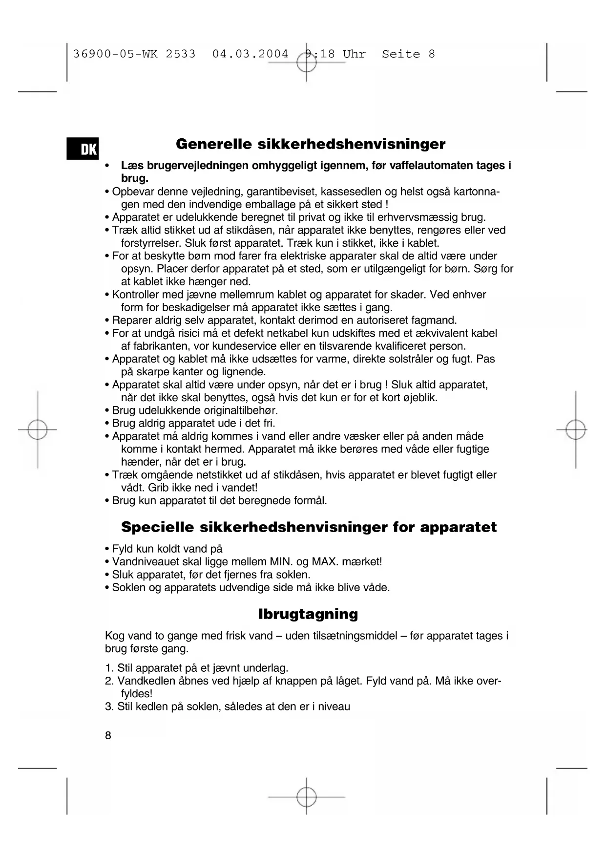 - Læs brugervejledningen omhyggeligt igennem, før vaffelautomaten tages i brug.