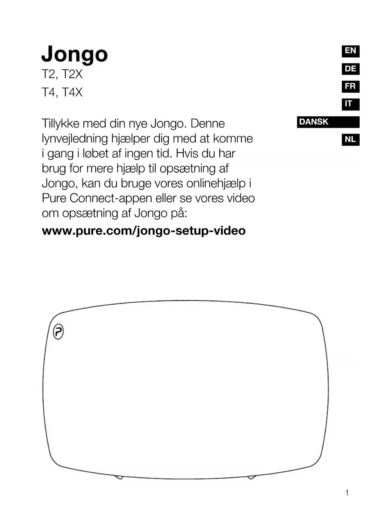 Tillykke med din nye Jongo . Denne lynvejledning hjælper dig med at komme i gang i løbet af ingen tid. Hvis du har brug for mere hjælp til opsætning af Jongo, kan du bruge vores onlinehjælp i Pure Connect-appen eller se vores video om opsætning af Jongo på: www.pure.com/jongo-setup-video T2, T2X Jongo_T2X_T4X_QSG-Euro-v2.indb 1 9/16/2014 5:35:35 PM T4, T4X2 Jongo – Sikkerhedsanvisninger