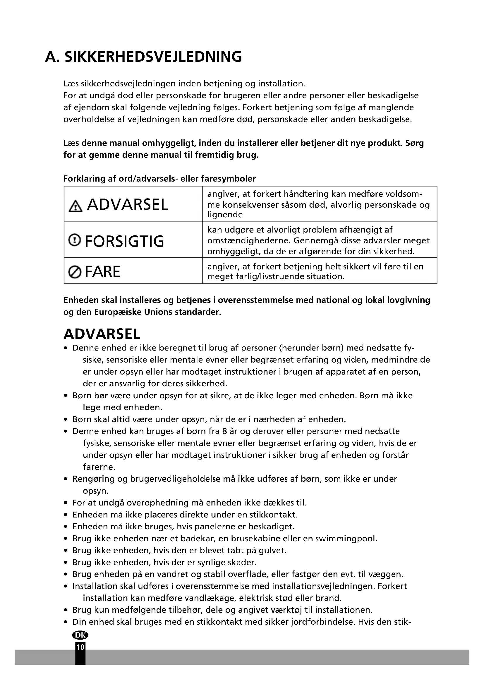 9A. SIKKERHEDSVEJLEDNING Læs sikkerhedsvejledningen inden betjening og installation. For at undgå død eller personskade for brugeren eller andre personer eller beskadigelse af ejendom skal følgende vejledning følges. Forkert betjening som følge af manglende overholdelse af vejledningen kan medføre død, personskade eller anden beskadigelse. Læs denne manual omhyggeligt, inden du installerer eller betjener dit nye produkt. Sørg for at gemme denne manual til fremtidig brug. Forklaring af ord/advarsels- eller faresymboler ADVARSEL angiver, at forkert håndtering kan medføre voldsom- me konsekvenser såsom død, alvorlig personskade og lignende FORSIGTIG kan udgøre et alvorligt problem afhængigt af omstændighederne. Gennemgå disse advarsler meget omhyggeligt, da de er afgørende for din sikkerhed. FARE angiver, at forkert betjening helt sikkert vil føre til en meget farlig/livstruende situation. Enheden skal installeres og betjenes i overensstemmelse med national og lokal lovgivning og den Europæiske Unions standarder. ADVARSEL