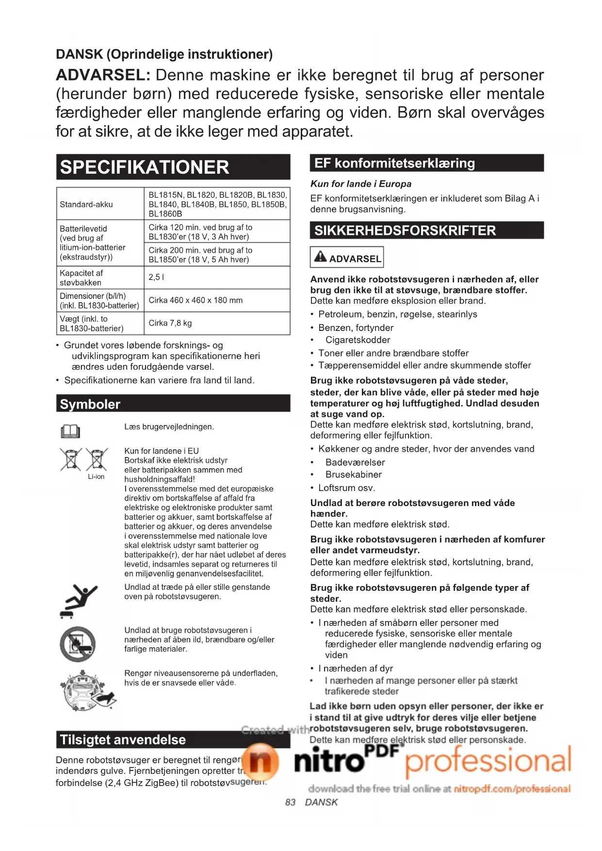 - Specikationerne kan variere fra land til land. Symboler Læs brugervejledningen. Li-ion Kun for landene i EU Bortskaf ikke elektrisk udstyr eller batteripakken sammen med husholdningsaffald! I overensstemmelse med det europæiske direktiv om bortskaffelse af affald fra elektriske og elektroniske produkter samt batterier og akkuer, samt bortskaffelse af batterier og akkuer, og deres anvendelse i overensstemmelse med nationale love skal elektrisk udstyr samt batterier og batteripakke(r), der har nået udløbet af deres levetid, indsamles separat og returneres til en miljøvenlig genanvendelsesfacilitet. Undlad at træde på eller stille genstande oven på robotstøvsugeren. Undlad at bruge robotstøvsugeren i nærheden af åben ild, brændbare og/eller farlige materialer. Rengør niveausensorerne på underaden, hvis de er snavsede eller våde. Tilsigtet anvendelse Denne robotstøvsuger er beregnet til rengøring af indendørs gulve. Fjernbetjeningen opretter trådløs forbindelse (2,4 GHz ZigBee) til robotstøvsugeren. DANSK (Oprindelige instruktioner) ADVARSEL: Denne maskine er ikke beregnet til brug af personer (herunder børn) med reducerede fysiske, sensoriske eller mentale færdigheder eller manglende erfaring og viden. Børn skal overvåges for at sikre, at de ikke leger med apparatet. EF konformitetserklæring Kun for lande i Europa EF konformitetserklæringen er inkluderet som Bilag A i denne brugsanvisning. SIKKERHEDSFORSKRIFTER ADVARSEL Anvend ikke robotstøvsugeren i nærheden af, eller brug den ikke til at støvsuge, brændbare stoffer. Dette kan medføre eksplosion eller brand.