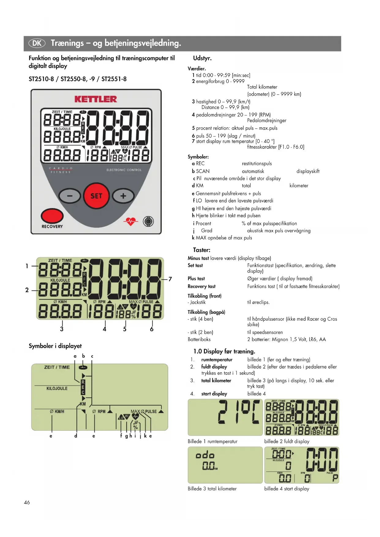 Datum Stupeň zátěže Vzdálenost Čas P1 P2 Kondiční (v km) (v min.) známka46 Udstyr. Værdier. 1 tid 0:00 - 99:59 [min:sec] 2 energiforbrug 0 - 9999 Total kilometer (odometer) (0 – 9999 km) 3 hastighed 0 – 99,9 (km/t) Distance 0 – 99,9 (km) 4 pedalomdrejninger 20 – 199 (RPM) Pedalomdrejninger 5 procent relation: aktuel puls – max.puls 6 puls 50 – 199 (slag / minut) 7 stort display rum temperatur [0 - 40 °] fitnesskarakter [F1.0 - F6.0] Symboler: a REC restitutionspuls b SCAN automatisk displayskift c Pil nuværende område i det stor display d KM total kilometer e Gennemsnit pulsfrekvens + puls f LO lavere end den laveste pulsværdi g HI højere end den højeste pulsværdi h Hjerte blinker i takt med pulsen i Procent % af max pulsspecifikation j Grad akustisk max puls overvågning k MAX opnåelse af max puls Taster: Minus tast lavere værdi (display tilbage) Set tast Funktionstast (specifikation, ændring, slette display) Plus tast Øger værdier ( display fremad) Recovery tast Funktions tast ( til at fastsætte fitnesskarakter) Tilkobling (front) - Jackstik til øreclips. Tilkobling (bagpå) - stik (4 ben) til håndpulssensor (ikke med Racer og Cros sbike) - stik (2 ben) til speedsensoren Batteriboks 2 batterier: Mignon 1,5 Volt, LR6, AA