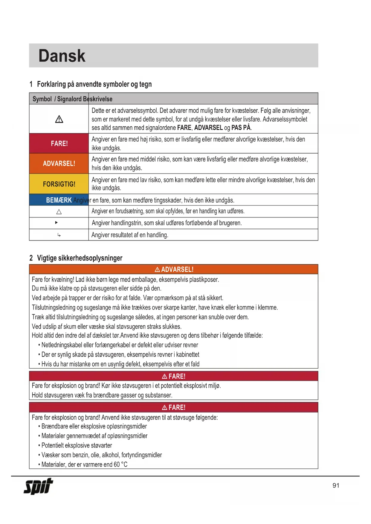 - ved ventilatoren ** ved slangen Maks. strøm på støvsugere med stikkontakt: 2000 W Hovedledningskabel på støvsugere med stikkontakt: H07RN-F 3G1,5100 16 Tests og godkendelser Der skal foretages elektroteknisk kontrol iht. forskrifterne til arbejdsmiljøbeskyttelse (DGUV V3 (Tyskland)) og DIN VDE 0701, del 1 og del 3. Disse kontroller skal iht. DIN VDE 0702 udføres med jævne mellemrum og efter reparation eller ændringer. Støvsugerne er godkendt iht. DS/EN 60335–2–69. BEMÆRK Brugt udstyr indeholder værdifulde materialer, som egner sig til genvinding. Smid ikke støvsugere ud sammen med det almindelige husholdningsaffald, men bortskaf det på korrekt vis via egnede indsamlingssystemer, f. eks. via kommunens genbrugsstationer. 17 Overensstemmelseserklæring Vi erklærer hermed, at nedenfor beskrevne maskine overholder de relevante grundlæggende sikkerheds- og sundhedskrav i EC-direktiverne, såvel i dens grundlæggende design og konstruktion som i den version, der er sat i omsætning hos os. Denne erklæring ophører med at være gyldig, hvis maskinen ændres uden vores forudgående godkendelse. Produkt: Støvsuger til vådt og tørt materiale Type: ISP model AC 1630 P Apparatets design svarer til følgende relevante bestemmelser: EC-maskindirektiv 2006/42/EU EC-direktiv EMC 2014/30/EC ROHS 2011/65/EU EC-maskindirektiv 2006/42/EU inklusive ændringer: DIN EN 60335-1 (VDE 0700-1):2012-10; EN 60335-1:2012 DIN EN 60335-1 Ber.1 (VDE 700-1 Ber.1):2014-04; EN 60335-1:2012/AC:2014; EN 60335-1:2012/A11:2014 EN 60335-2-69:2012; DIN EN 62233 (VDE 0700-366 Ber.1):2009-04; EN 62233 Ber.1:2008; DIN EN ISO 12100:2011-03; EN ISO 12100:2010 EC-direktiv EMC 2014/30/EC: DIN EN 55014-1 (VDE 0875-14-1):2012-05; EN 55014-1:2006 + A1:2009 + A2:2011 DIN EN 61000-3-2 (VDE 0838-2):2015-03; EN 61000-3-2:2014; DIN EN 61000-3-3 (VDE 0838-3):2014-03; EN 61000-3-3:2013; DIN EN 55014-2 (VDE 0875-14-2):2009; EN 55014-2:1997 + A1:2001 + A2:2008 Kategori II-krav Følgende institut har testet og certiceret produktet: VDE Prüf- und Zertizierungsinstitut GmbH (EU-Kenn-Nr. 03666), Merianstr. 28, 63069 Offenbach Autoriseret dokumentationsrepræsentant: Spit S.A.S., 150 Avenue de Lyon, B.P.104,