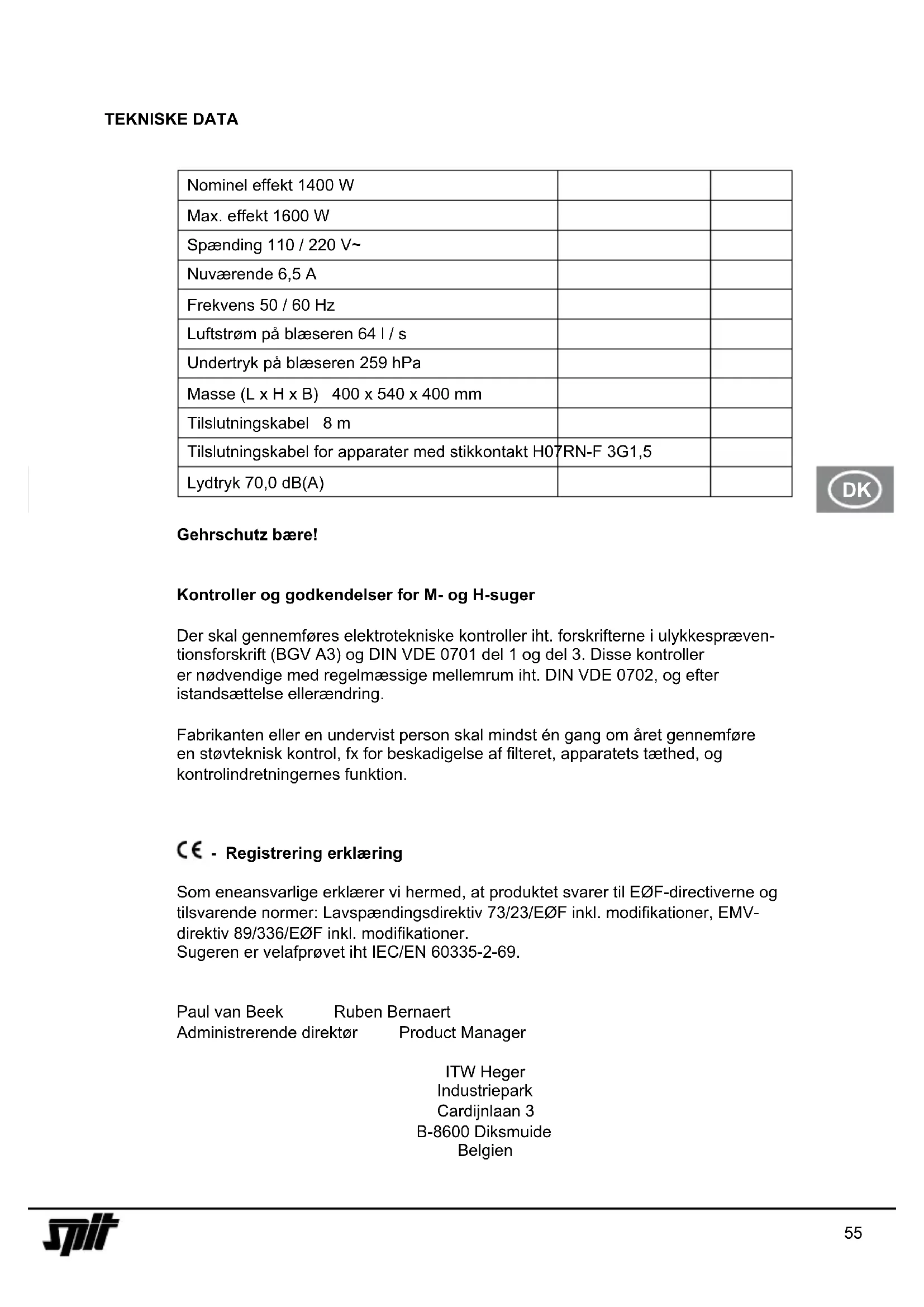 Som eneansvarlige erklærer vi hermed, at produktet svarer til E∅F-directiverne og tilsvarende normer: Lavspændingsdirektiv 73/23/E∅F inkl. modifikationer, EMV-direktiv 89/336/E∅F inkl. modifikationer. Sugeren er velafprøvet iht IEC/EN 60335-2-69.