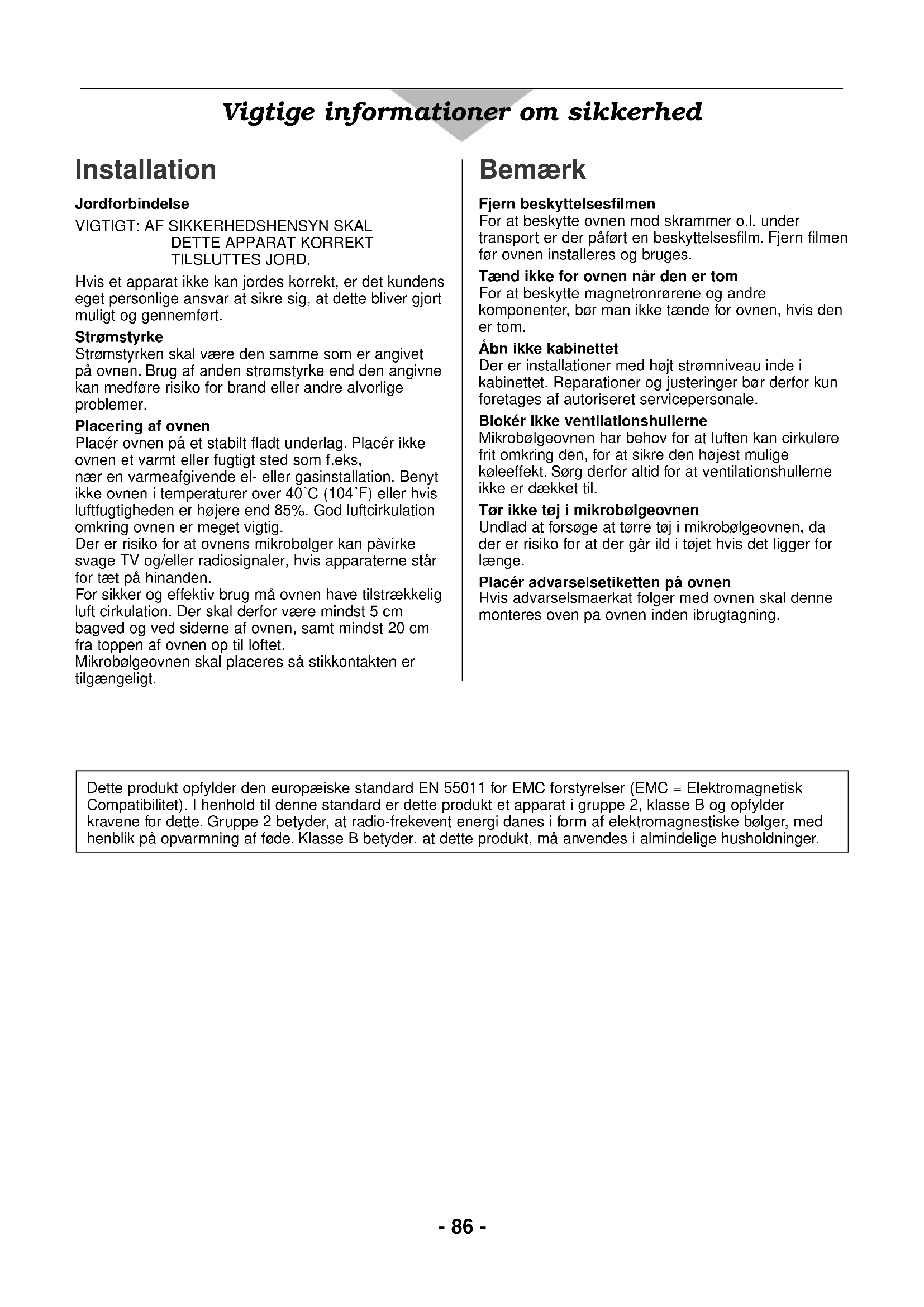 TILSLUTTES JORD. Hvis et apparat ikke kan jordes korrekt, er det kundens eget personlige ansvar at sikre sig, at dette bliver gjort muligt og gennemført. Strømstyrke Strømstyrken skal være den samme som er angivet på ovnen. Brug af anden strømstyrke end den angivne kan medføre risiko for brand eller andre alvorlige problemer. Placering af ovnen Placér ovnen på et stabilt fladt underlag. Placér ikke ovnen et varmt eller fugtigt sted som f.eks, nær en varmeafgivende el- eller gasinstallation. Benyt ikke ovnen i temperaturer over 40˚C (104˚F) eller hvis luftfugtigheden er højere end 85%. God luftcirkulation omkring ovnen er meget vigtig. Der er risiko for at ovnens mikrobølger kan påvirke svage TV og/eller radiosignaler, hvis apparaterne står for tæt på hinanden. For sikker og effektiv brug må ovnen have tilstrækkelig luft cirkulation. Der skal derfor være mindst 5 cm bagved og ved siderne af ovnen, samt mindst 20 cm fra toppen af ovnen op til loftet. Mikrobølgeovnen skal placeres så stikkontakten er tilgængeligt. Vigtige informationer om sikkerhed Bemærk Fjern beskyttelsesfilmen For at beskytte ovnen mod skrammer o.l. under transport er der påført en beskyttelsesfilm. Fjern filmen før ovnen installeres og bruges. Tænd ikke for ovnen når den er tom For at beskytte magnetronrørene og andre komponenter, bør man ikke tænde for ovnen, hvis den er tom. Åbn ikke kabinettet Der er installationer med højt strømniveau inde i kabinettet. Reparationer og justeringer bør derfor kun foretages af autoriseret servicepersonale. Blokér ikke ventilationshullerne Mikrobølgeovnen har behov for at luften kan cirkulere frit omkring den, for at sikre den højest mulige køleeffekt. Sørg derfor altid for at ventilationshullerne ikke er dækket til. Tør ikke tøj i mikrobølgeovnen Undlad at forsøge at tørre tøj i mikrobølgeovnen, da der er risiko for at der går ild i tøjet hvis det ligger for længe. Placér advarselsetiketten på ovnen Hvis advarselsmaerkat folger med ovnen skal denne monteres oven pa ovnen inden ibrugtagning. Dette produkt opfylder den europæiske standard EN 55011 for EMC forstyrelser (EMC = Elektromagnetisk Compatibilitet). I henhold til denne standard er dette produkt et apparat i gruppe 2, klasse B og opfylder kravene for dette. Gruppe 2 betyder, at radio-frekevent energi danes i form af elektromagnestiske bølger, med henblik på opvarmning af føde. Klasse B betyder, at dette produkt, må anvendes i almindelige husholdninger.- 87 - Dansk Vigtige informationer om sikkerhed Advarsel